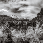 Step into a world of Red Rock Serenity. This mesmerizing black-and-white landscape captures the essence of nature's raw beauty. Snow-capped mounta...[+]