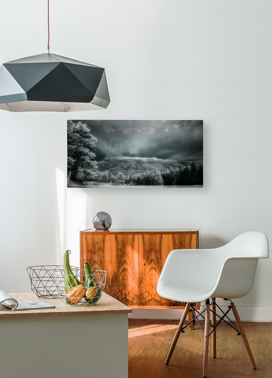 Step into the hauntingly beautiful world of "Mueller's Mystique," where the ethereal dance of light and shadow beckons you to explore a landscape shrouded in mystery. A vast expanse of grassland gives way to a dense forest of towering coniferous trees, their branches reaching towards the heavens. In the distance, snow-capped mountain peaks rise majestically against a brooding sky, clouds heavy with the promise of an impending storm. A lone tree stands sentinel in the foreground, its gnarled branches whispering secrets of ancient forests. As you delve deeper into this captivating image, the interplay of light and shadow draws you further into a realm where time seems to stand still. Each detail, from the delicate dance of leaves in the wind to the rugged texture of the tree bark, invites you to lose yourself in the allure of nature's untamed splendor. Discover the timeless beauty of "Mueller's Mystique" and unlock the secrets of this enigmatic photograph that captures a moment of pure magic. Let the power of nature's raw beauty transport you to a world where every shadow holds a hidden story and every ray of light reveals a new wonder.