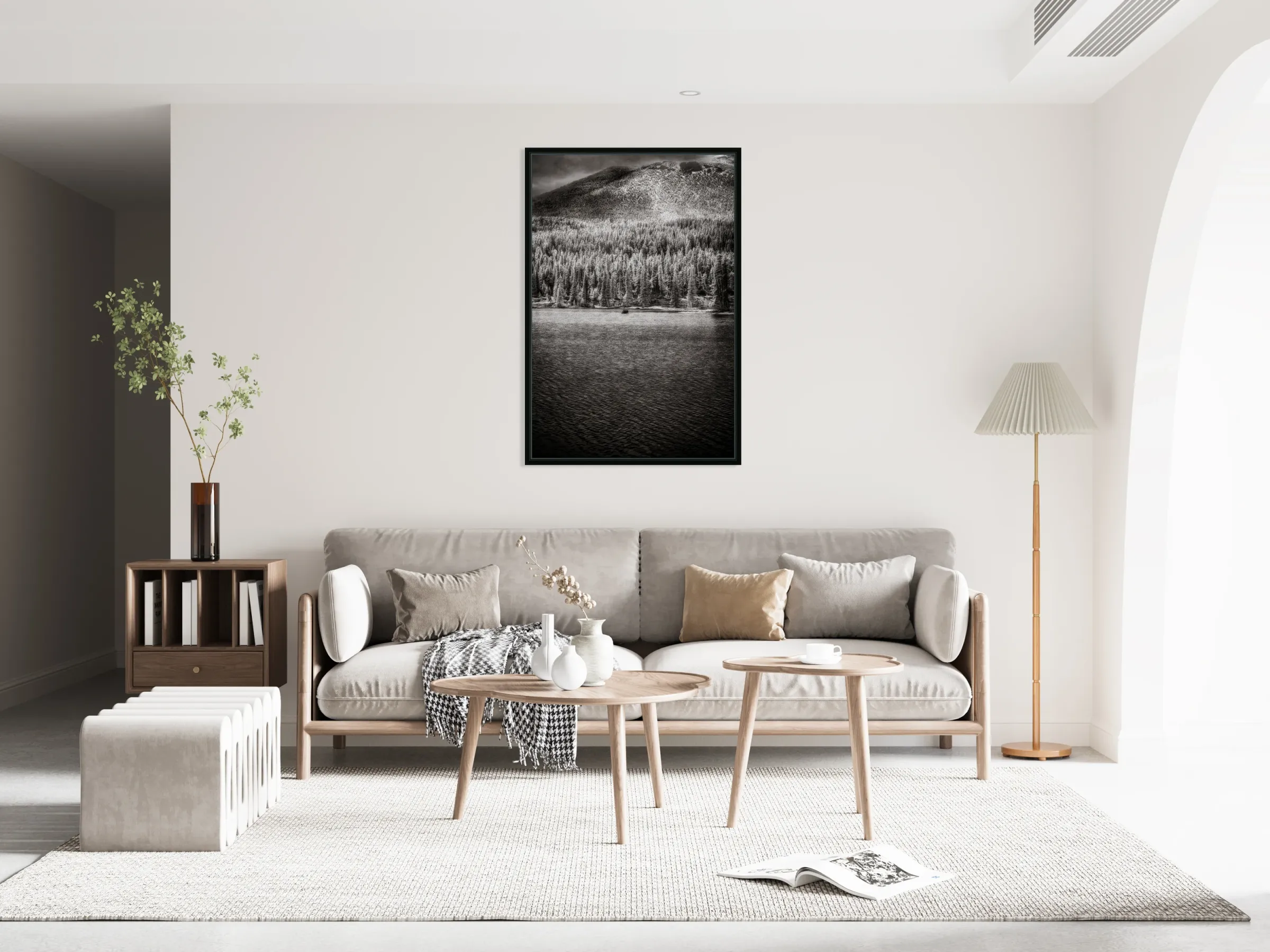 Step into the realm of Enchanted Wilderness, where nature's magnificence unfolds in its most exquisite form. In this captivating piece, "Moose Haven in Rocky Mountain Park," I immerse myself in a tranquil landscape that leaves me spellbound. The monochrome photograph captures the essence of a serene lake, mirroring the sky and the lush forest that surrounds it with impeccable clarity. It feels like entering a masterpiece, where each brushstroke is a testament to nature's artistry. The dense forest, the towering mountains, and the soft snowfall blend together to craft a mystical ambiance that is both enchanting and mysterious. It's akin to stepping into a fairy tale, where magic fills the air and dreams come to life. As I behold the untouched beauty of the wilderness and the graceful presence of wildlife in this mesmerizing artwork, a profound sense of tranquility washes over me. It's a moment frozen in time, where nature's wonders unfold before me in all their splendor. Join me on this journey through Enchanted Wilderness: Moose Haven in Rocky Mountain Park, and let the enchanting beauty of the natural world captivate your spirit with wonder and awe.