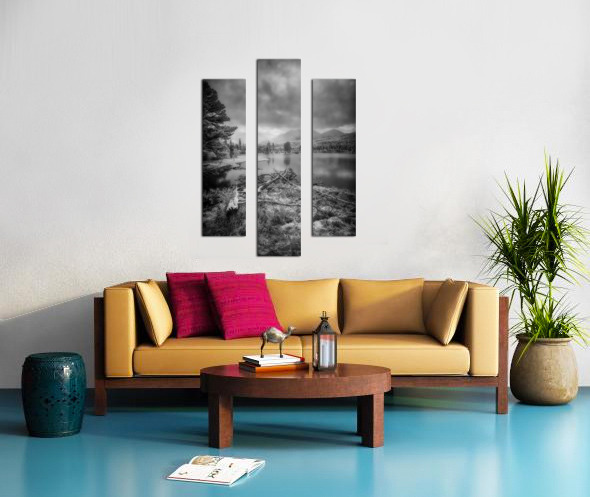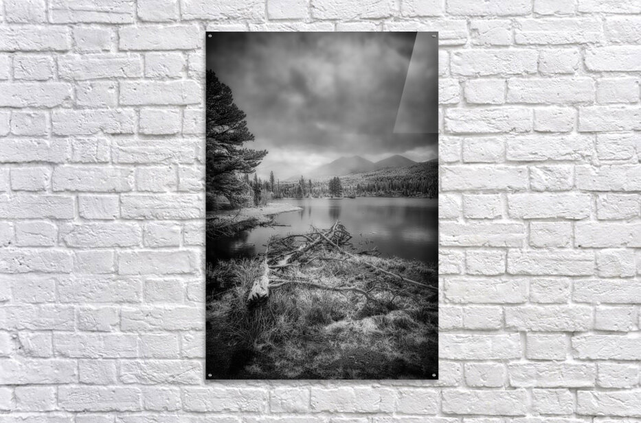Step into a world of enchantment with "Fallen Sentinels," a captivating photograph that transports you to a tranquil mountainous landscape shrouded in