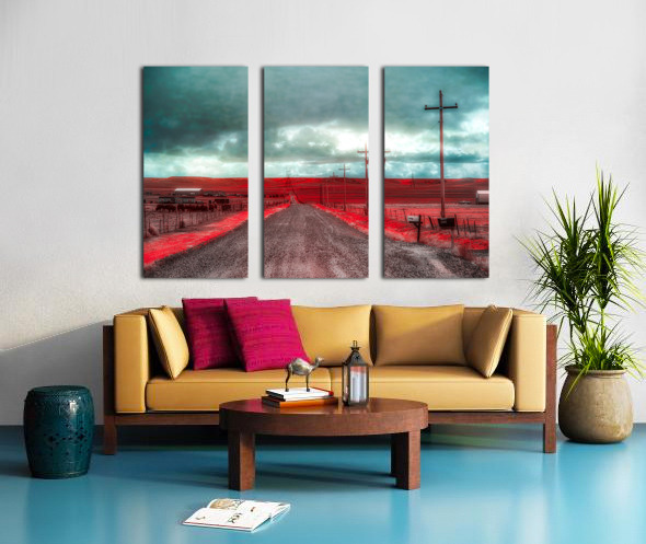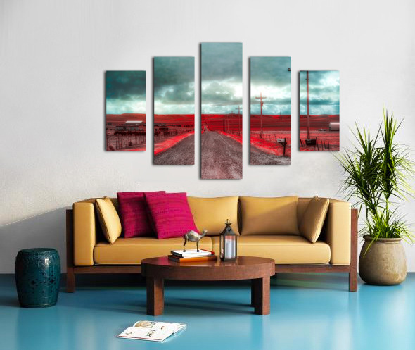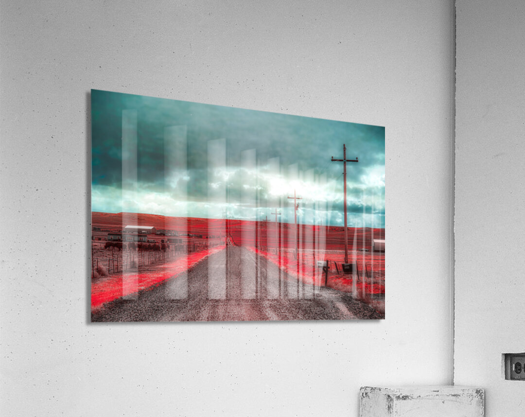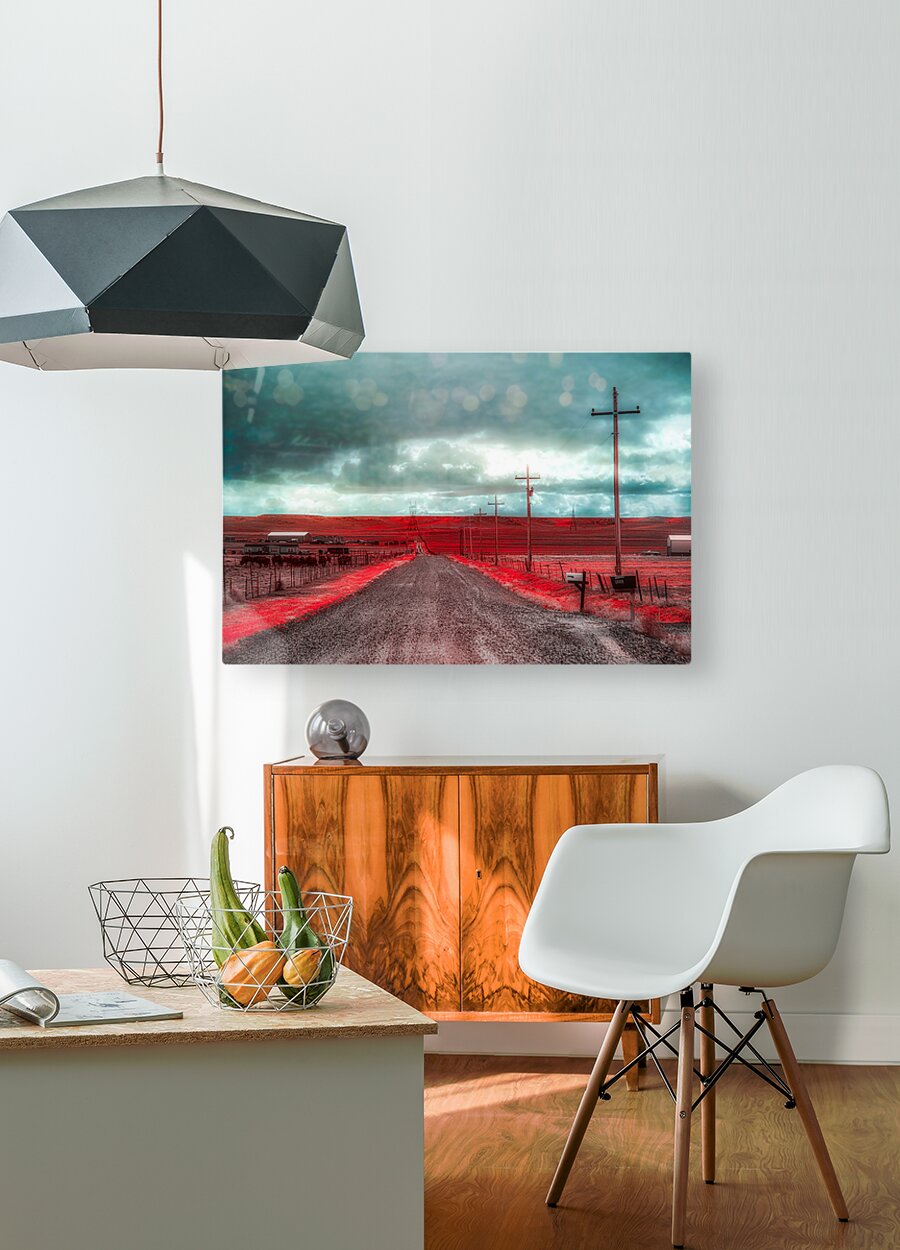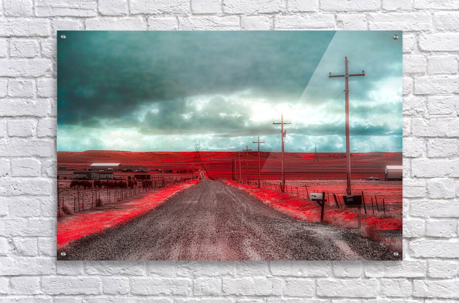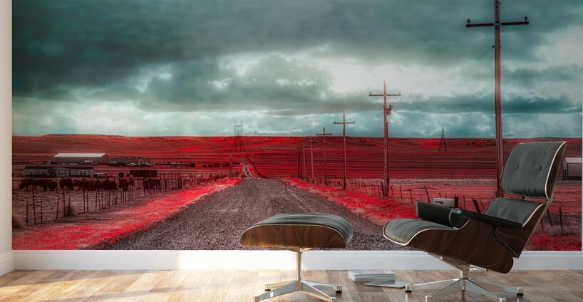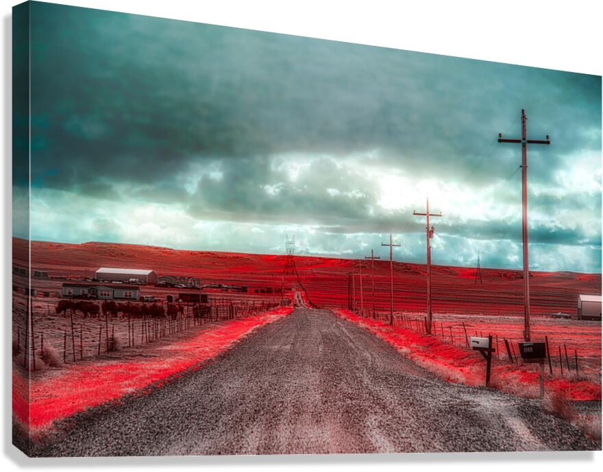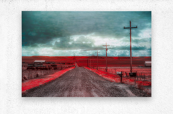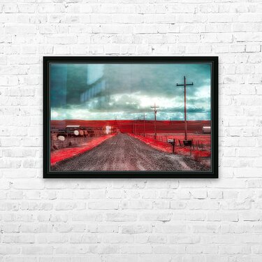 Embark on a journey through "Red Horizon: Carr Colorado," where the world transforms into a mesmerizing blend of deep reds and cool grays. As you travel along the winding dirt road, you'll be captivated by the sights that unfold before you. The road stretches endlessly towards the horizon, flanked by towering utility poles and lush vegetation. It's a scene straight out of a storybook, where every twist and turn promises adventure. Above, the overcast sky adds to the drama of the landscape, with clouds swirling ominously overhead. Despite the foreboding atmosphere, there's an undeniable sense of intrigue and excitement in the air. Amidst the wilderness, a cluster of mysterious buildings emerges, hinting at human presence in this surreal, otherworldly setting. It's a reminder that civilization leaves its mark even in the most remote places. But what truly sets this scene apart is the bold use of color. The deep reds and cool grays create a mystical atmosphere, transporting you to a place where reality and imagination intertwine in a mesmerizing dance. So come along and explore the depths of "Red Horizon: Carr Colorado." Lose yourself in its enigmatic allure and let your imagination run wild amidst the captivating landscape.