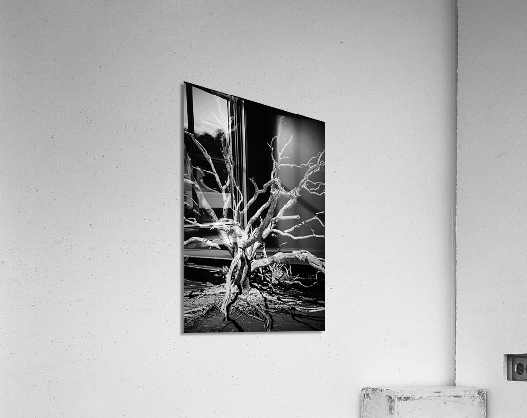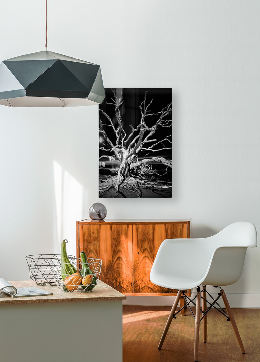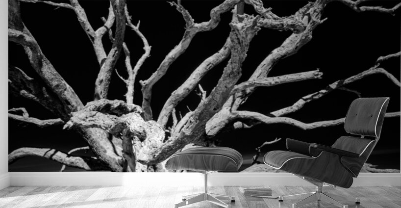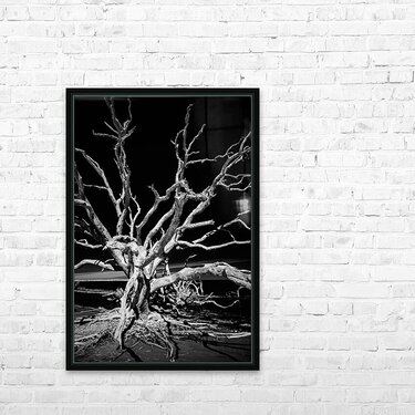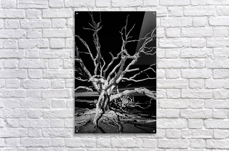 A black and white infrared image on Driftwood Beach Jekyll Island Georgia that looks like fingers showing dead tree barkless tree branches.