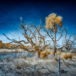 Step into a realm where nature's poetry comes alive – witness the haunting beauty of Driftwood Beach, nestled on the shores of Jekyll Island, Georgia. In this mesmerizing infrared image, a scene of ethereal tranquility unfolds before your eyes. At the end of a row of majestic dead trees, weathered by time and tides, stands a lone palm tree, its silhouette striking against the marshy expanse. Like a sentinel guarding over the landscape, it stands tall, a testament to resilience amidst the elements. Through the lens of infrared photography, the world transforms into a surreal dreamscape, where reality merges with imagination. In this timeless spectacle, hues of infrared breathe life into the scene, infusing it with an otherworldly glow that dances across the landscape. Here, nature's melancholic beauty takes center stage, weaving a tale of contrasts and serenity. The juxtaposition of life, decay, stillness, and motion creates a visual symphony that resonates deep within the soul. As you gaze upon this captivating image, let yourself be transported to a realm where time stands still and the whispers of the wind carry the secrets of centuries past. Driftwood Beach beckons, inviting you to lose yourself in its mesmerizing embrace and discover the profound beauty that lies within. Experience the magic of Driftwood Beach – where every photograph tells a story, and every moment is a masterpiece waiting to be captured.