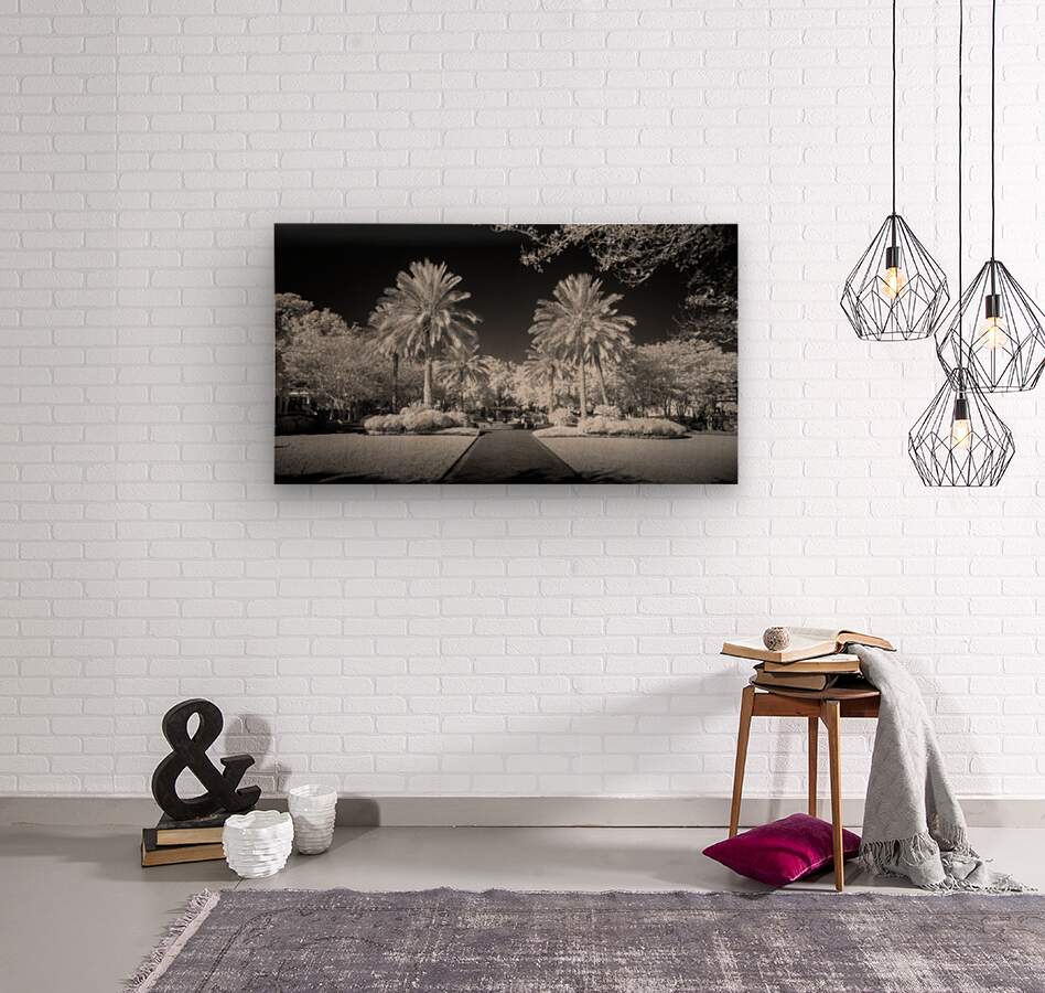 A pathway captured in infrared of two palms flanking a walkway in Saint Maryrs Georgia.