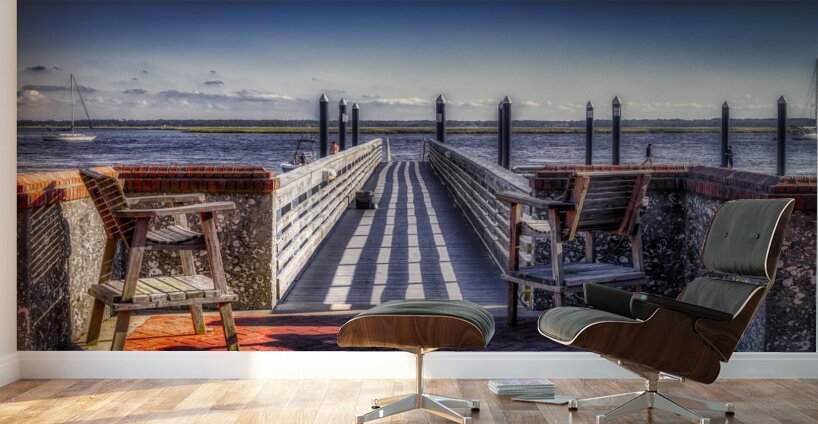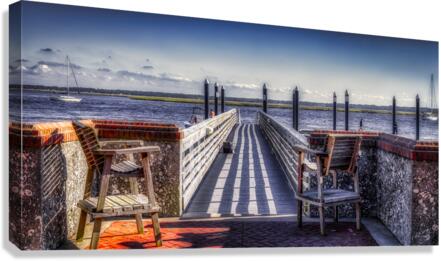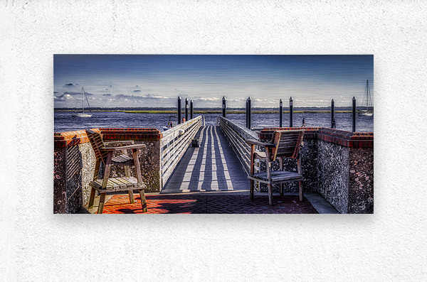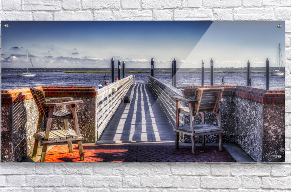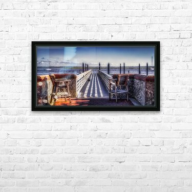 As I step onto the wooden pier, I'm immediately captivated by the serene beauty of Seaside Stillness. The clear blue sky and fluffy clouds overhead create a peaceful atmosphere that invites me to slow down and appreciate the beauty around me. The sun casts distinct stripes of light and shadow across the pier's wooden planks, creating a mesmerizing pattern reminiscent of a zebra crossing. Weathered brick walls capped with terracotta tiles frame the scene on either side, adding texture and character to the waterfront setting. Wooden benches invite me to sit and enjoy the view, while dark bollards mark the entrance to the main section of the pier. As I gaze out over the calm water, I spot a couple of sailboats leisurely gliding along, their white sails standing out against the serene backdrop. In the distance, people engage in various activities, adding a sense of life and leisure to the tranquil scene. Despite the hustle and bustle of daily life, Seaside Stillness reminds me to take a moment to pause, breathe deeply, and appreciate the beauty that surrounds me. This captivating artwork transports me to a place of calm and beauty, where the world's worries fade away. I'm left with nothing but peace and tranquility.