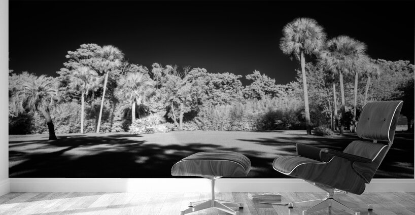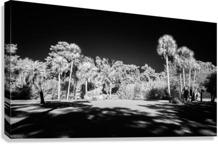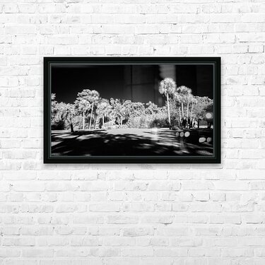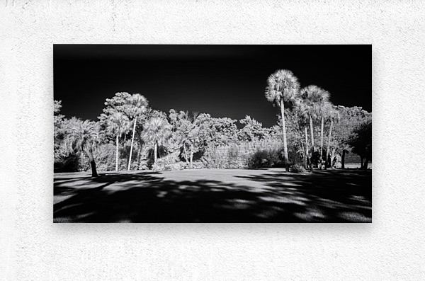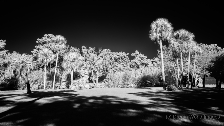 Light hitting palm trees in the center of an infrared scene.
