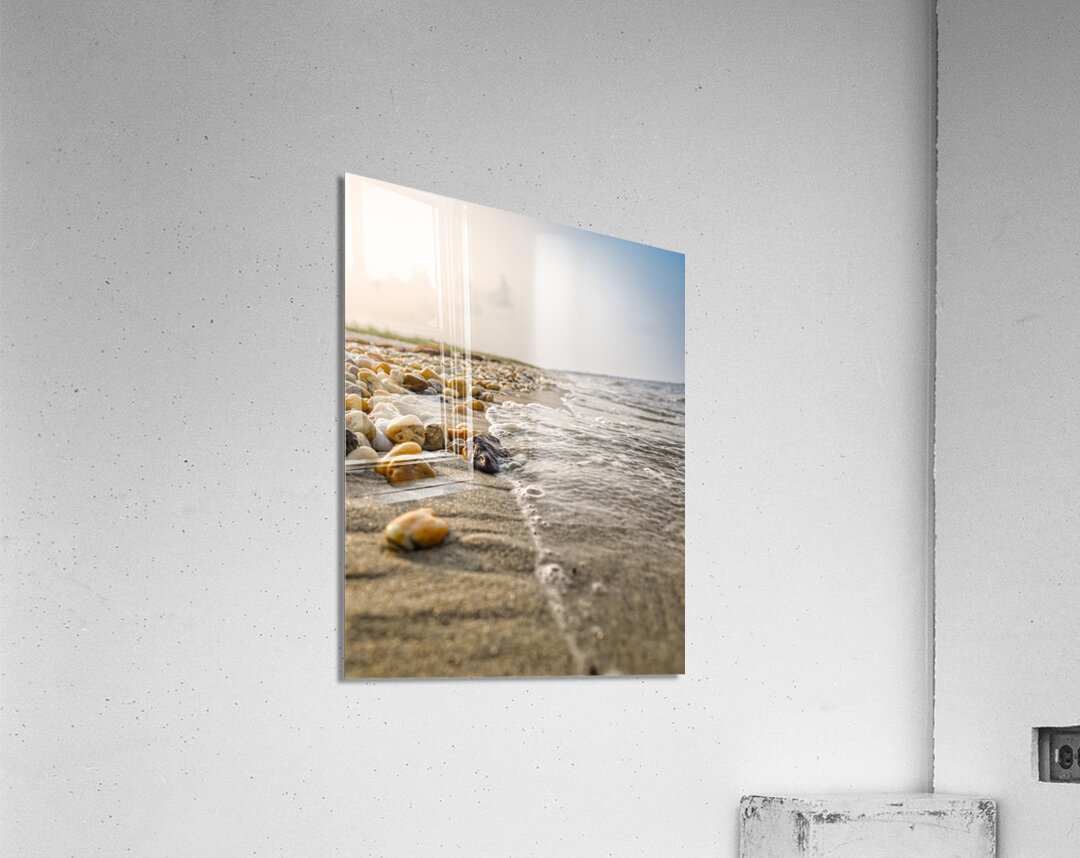 As I gaze upon the image before me, I'm transported to the tranquil shores of a serene beach, where every detail speaks of nature's quiet beauty. The foreground is adorned with an array of smooth pebbles, their earthy hues ranging from soft beige to rich brown, with one particularly striking dark stone capturing my attention. These stones, scattered across the sand, glimmer slightly with moisture, adding to the allure of the scene. In the distance, the sea gently caresses the sandy shore, its foamy waves creating a mesmerizing interplay of textures against the smooth stones and fine grains of sand. The photograph's shallow focus draws me closer to the intricate details of the shoreline, blurring the background to soften the horizon where the sea meets the sky. A pale sky, tinged with hints of clouds, blends seamlessly with the translucent waters, illuminated by the soft, warm glow of the sun casting its light during the early morning or late afternoon. This intimate perspective of nature's small-scale beauty evokes a sense of tranquility and contemplation within me. It's as though I'm lying on the beach, eyes just above the sand, fully immersed in the textures and colors of this serene coastal environment. Shoreline Serenade captures the beach's quiet beauty, inviting viewers to embrace the peacefulness and immerse themselves in the tranquil coastal scenery.