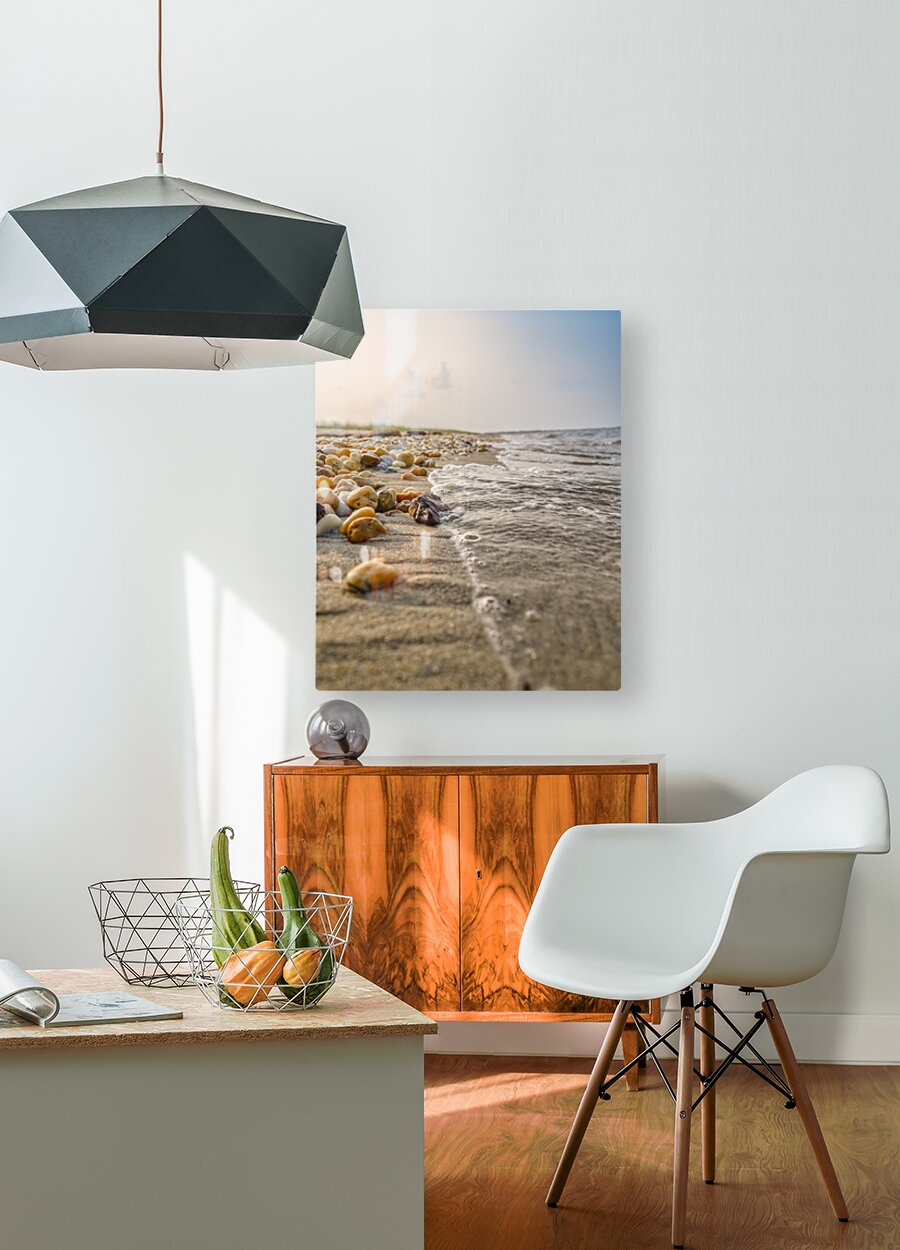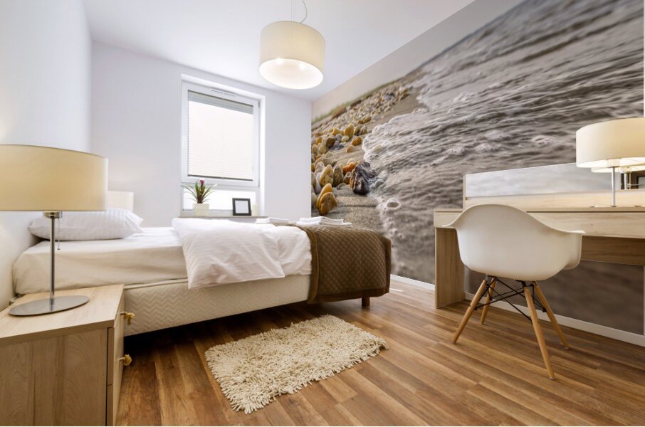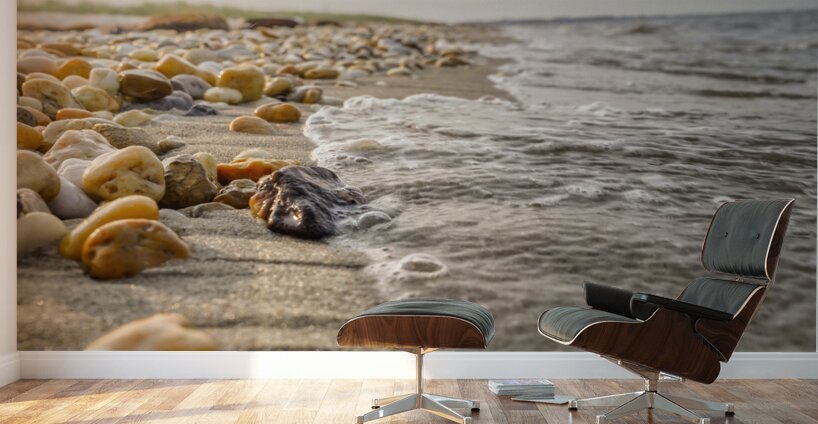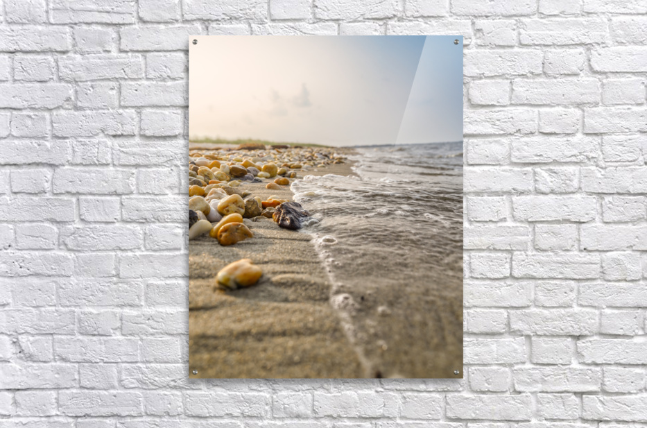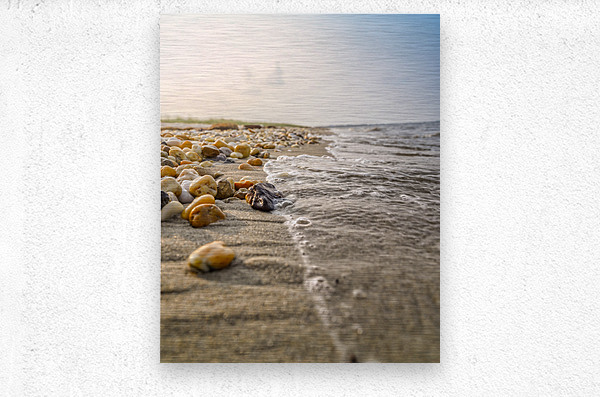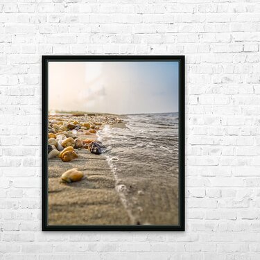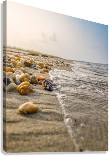 As I gaze upon the image before me, I'm transported to the tranquil shores of a serene beach, where every detail speaks of nature's quiet beauty. The foreground is adorned with an array of smooth pebbles, their earthy hues ranging from soft beige to rich brown, with one particularly striking dark stone capturing my attention. These stones, scattered across the sand, glimmer slightly with moisture, adding to the allure of the scene. In the distance, the sea gently caresses the sandy shore, its foamy waves creating a mesmerizing interplay of textures against the smooth stones and fine grains of sand. The photograph's shallow focus draws me closer to the intricate details of the shoreline, blurring the background to soften the horizon where the sea meets the sky. A pale sky, tinged with hints of clouds, blends seamlessly with the translucent waters, illuminated by the soft, warm glow of the sun casting its light during the early morning or late afternoon. This intimate perspective of nature's small-scale beauty evokes a sense of tranquility and contemplation within me. It's as though I'm lying on the beach, eyes just above the sand, fully immersed in the textures and colors of this serene coastal environment. Shoreline Serenade captures the beach's quiet beauty, inviting viewers to embrace the peacefulness and immerse themselves in the tranquil coastal scenery.