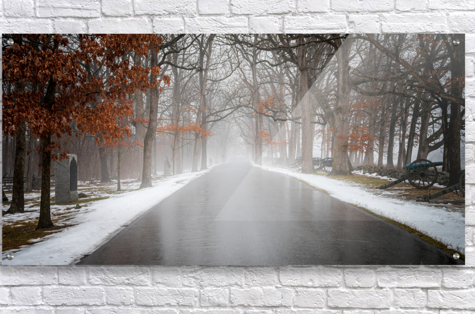 Where history meets winter's quiet, Confederate Avenue stretches into misty memory. Through nature's own filters of snow and fog, this sacred path becomes a meditation on time and remembrance. Part of the "Hallowed Dreams" collection, this image captures the solemn beauty of Gettysburg's hallowed ground, where every step echoes with stories of the past.