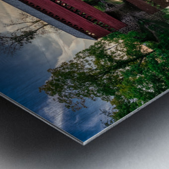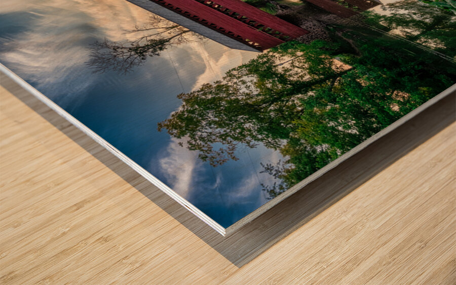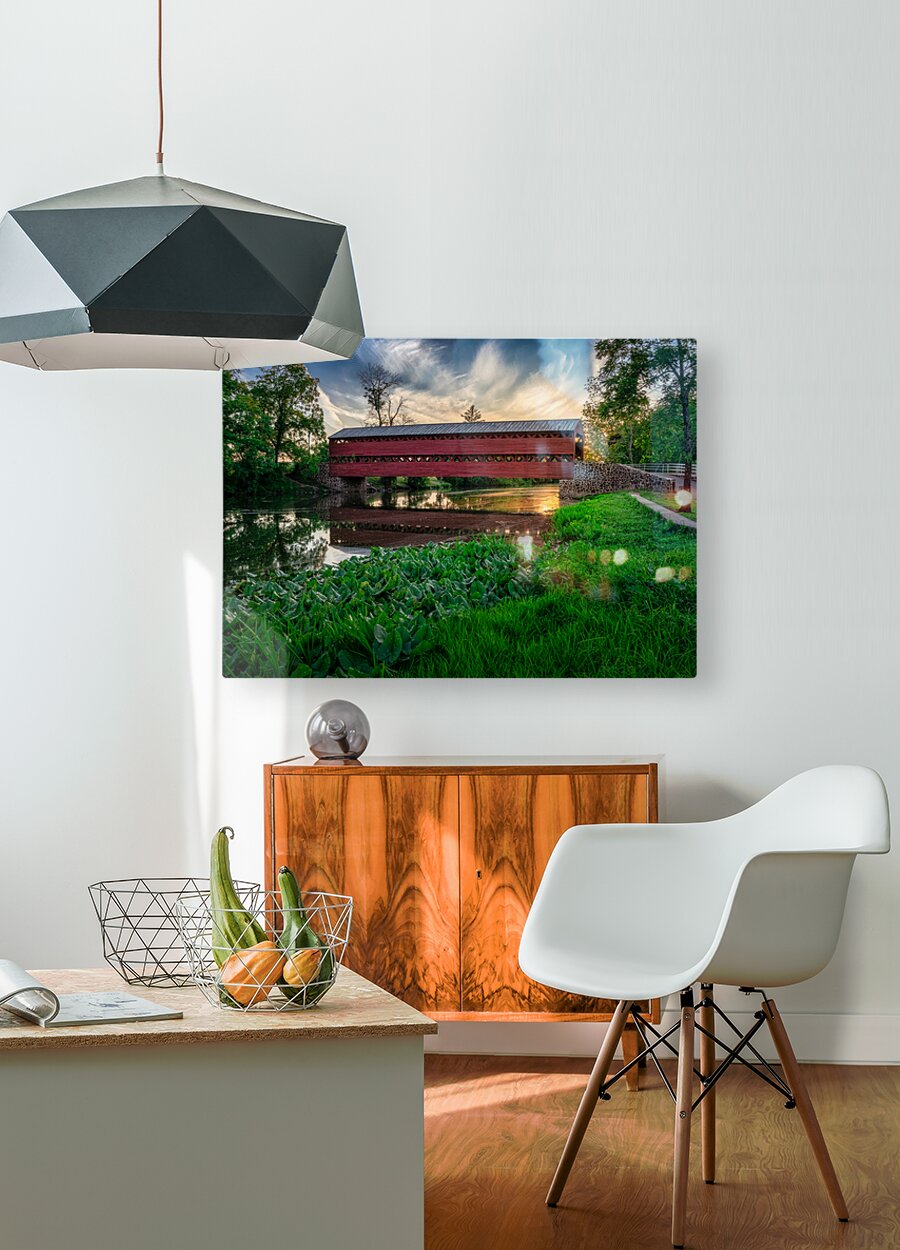 Step into a realm of tranquility and wonder with our latest masterpiece, "Serene Sunset Behind Sachs Covered Bridge." This artwork captures the essence of a dreamlike landscape, where a traditional red-covered bridge stands majestically over a calm body of water, enveloped in the ethereal glow of the setting sun. The bridge's intricate design, with its pattern of cut-out rectangles, adds a layer of mystery to the scene, drawing the viewer in with its subtle allure. The bridge's reflection in the placid waters below doubles the enchantment, creating a sense of otherworldly beauty. As the golden light filters through the lush greenery and dances upon the gentle stream, the viewer feels peaceful serenity. The dynamic cloud patterns in the sky add a touch of drama and movement to the scene, enhancing the overall sense of mystery and enchantment. Escape into a realm where nature and architecture blend seamlessly, where every detail whispers of magic and wonder. Let "Serene Sunset Behind Sachs Covered Bridge" transport you to a place of endless beauty and imagination.
