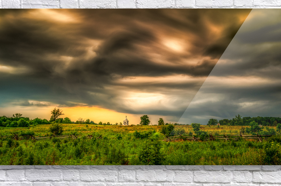 In the hallowed fields of Gettysburg, where courage and sacrifice still echo across time, I witnessed a moment when heaven and earth seemed to share memories of July 1863. The Pennsylvania Monument, standing proud against a tempestuous sky, became nature's own tribute to those who fought here. As storm clouds rolled across the battlefield like phantom battalions, they painted the sky in otherworldly copper and gold. The late afternoon light pierced through breaks in the clouds like divine spotlights, illuminating the peaceful fields below - fields that once thundered with the footsteps of soldiers, now quiet save for the whispered promises of approaching rain. Some say Gettysburg holds onto its stories in the very air above these sacred grounds. On this evening, as the storm gathered its strength and the monument stood resolute beneath nature's drama, I couldn't help but feel those stories being retold in the language of light and shadow. The Pennsylvania Monument, eternal guardian of memory, seemed to reach toward those magnificent clouds as if connecting present to past, earth to sky, peace to remembrance.