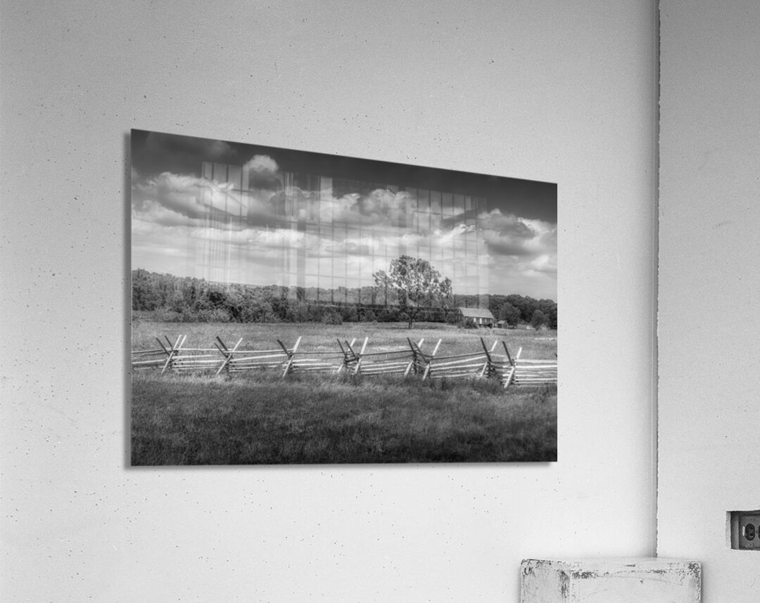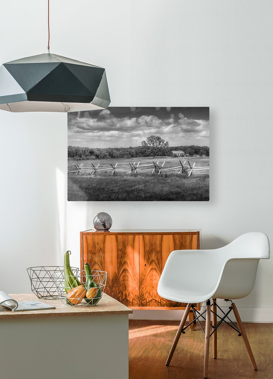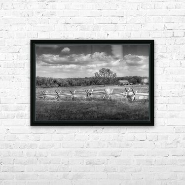 As I strolled along Emmitsburg Road in Gettysburg, I couldn't resist capturing the breathtaking scenery that unfolded before me. The image I titled "Solitude Unveiled: Whispers of the Countryside" encapsulates the serene beauty of the rural landscape. In the foreground, a zigzagging split-rail fence, also known as a snake fence, leads the eye diagonally into the scene, adding rustic charm to the photograph. Beyond the fence lies an open field adorned with low vegetation and patches of light and shadow, hinting at the presence of clouds above. Standing prominently in the center of the frame is a solitary deciduous tree, its dark leaves contrasting against the lighter surroundings. Adjacent to the tree, a modest-sized farmhouse with a pitched roof is nestled among trees and shrubbery, evoking a sense of peaceful rural life. The background is dominated by a line of dense trees that fade into the horizon, with a dramatic sky filled with billowing clouds overhead. The use of black-and-white photography enhances the textures and contrasts within the landscape, capturing the dynamic yet tranquil qualities of the countryside. Experience the tranquility and charm of rural living with "Solitude Unveiled: Whispers of the Countryside." This captivating photograph invites you to immerse yourself in the beauty of nature and find solace in its serene embrace.