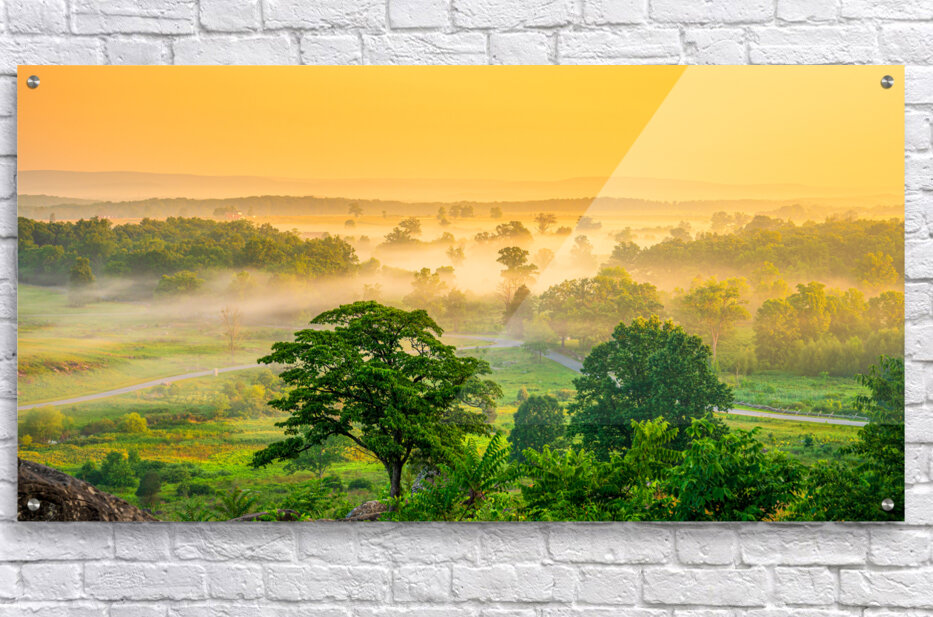On an early summer morning, standing atop Little Round Top in Gettysburg, a mesmerizing scene unfolds. The valley below is draped in a delicate mornin