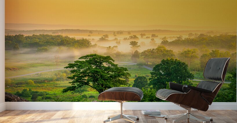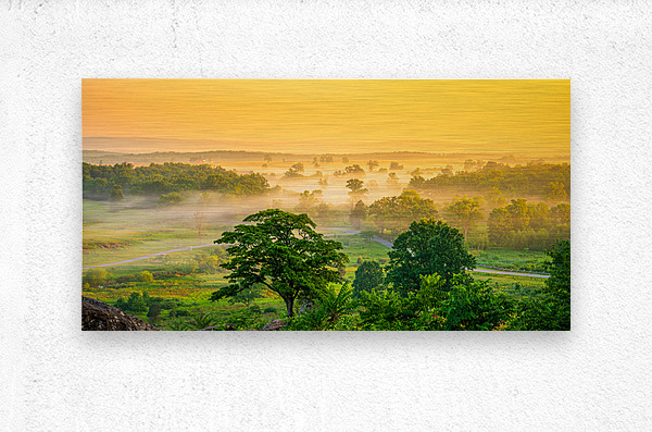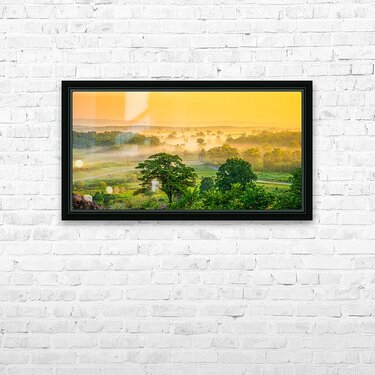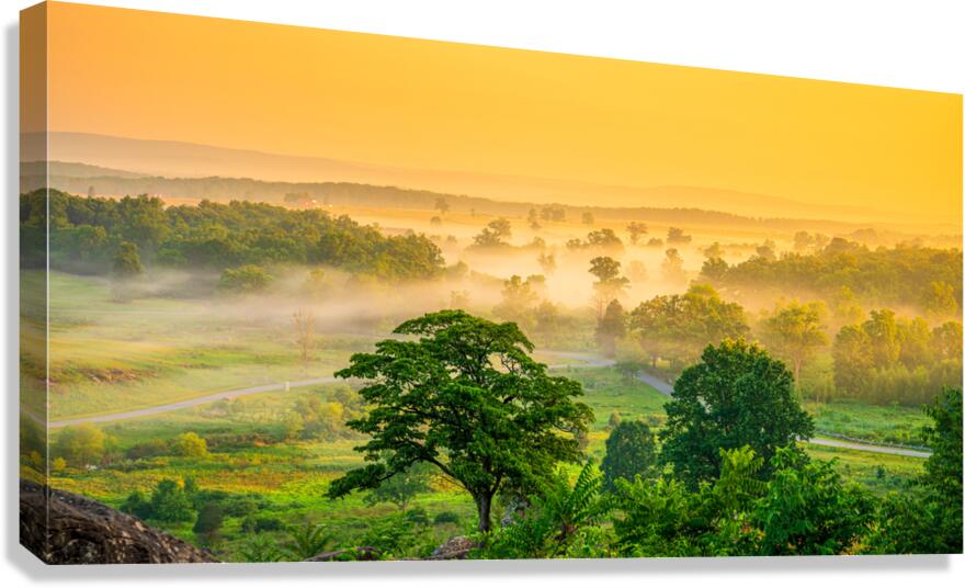 On an early summer morning, standing atop Little Round Top in Gettysburg, a mesmerizing scene unfolds. The valley below is draped in a delicate mornin