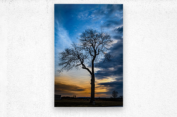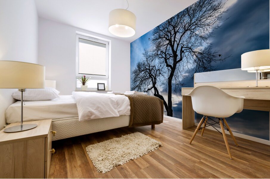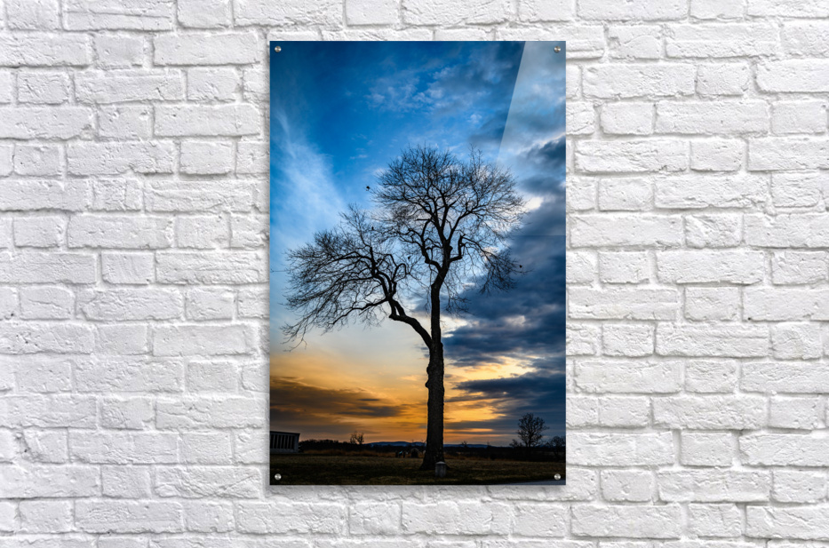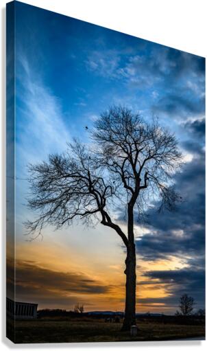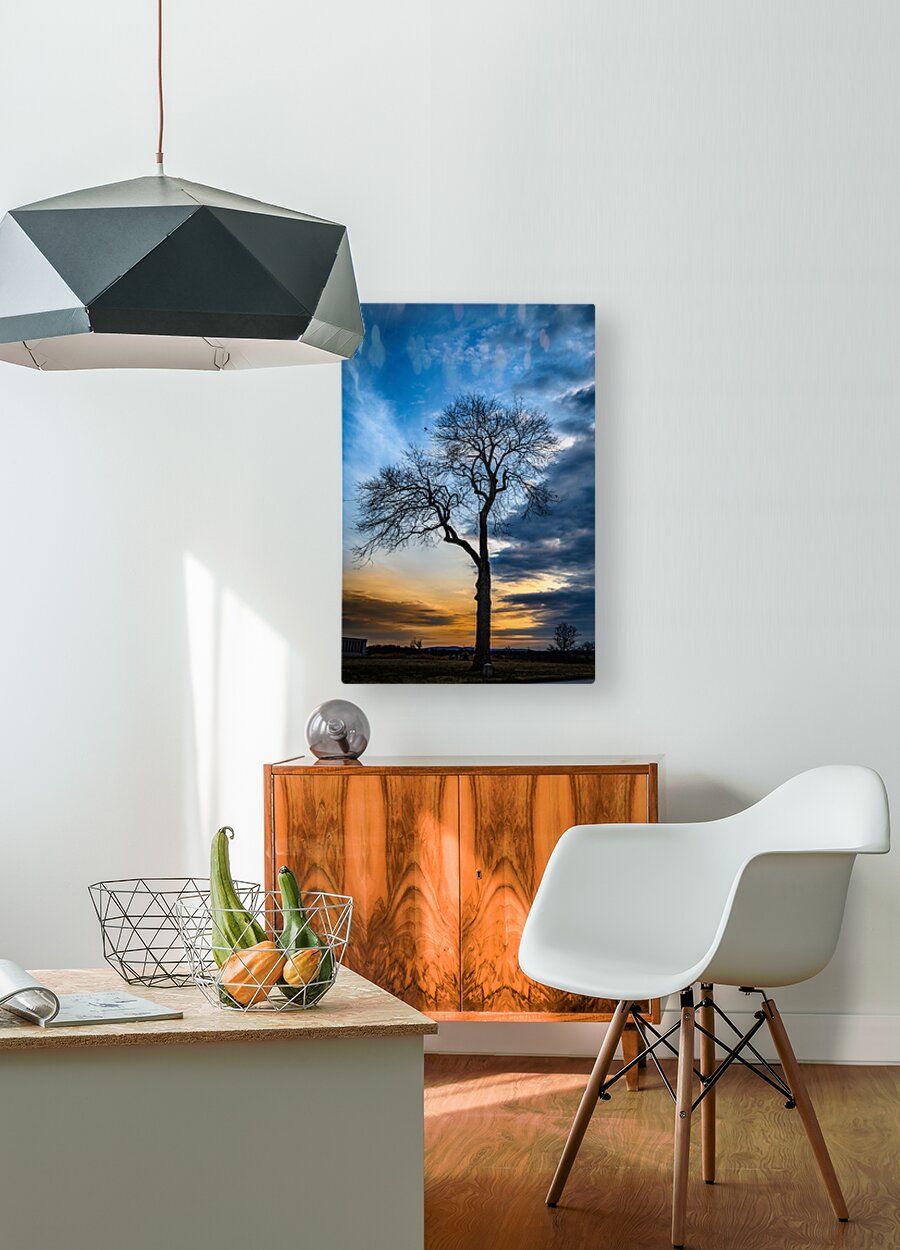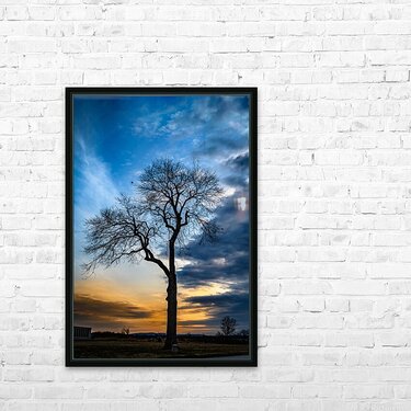 Nature's own theater unfolds as winter branches reach toward a dramatic evening sky, where deep blues battle with golden light for dominance. This bare sentinel stands in perfect silhouette, its intricate branches creating nature's own artistic statement against the canvas of dusk. The composition captures that magical moment when day surrenders to night, transforming a simple winter tree into a powerful meditation on solitude and beauty.