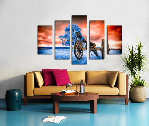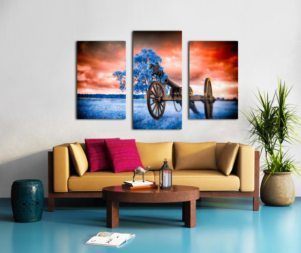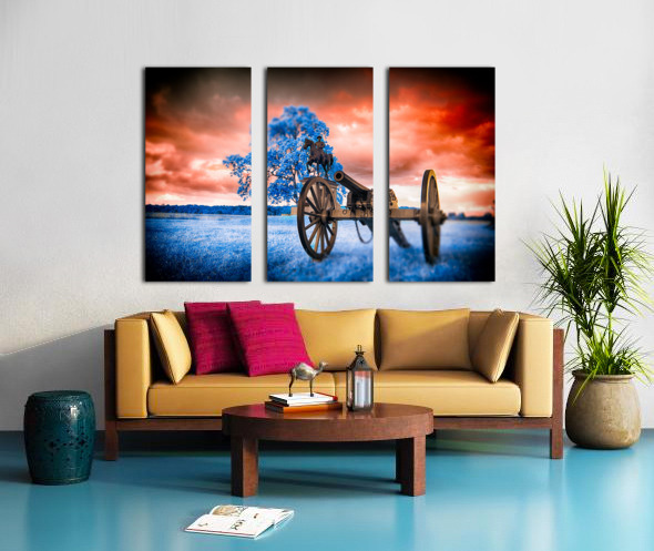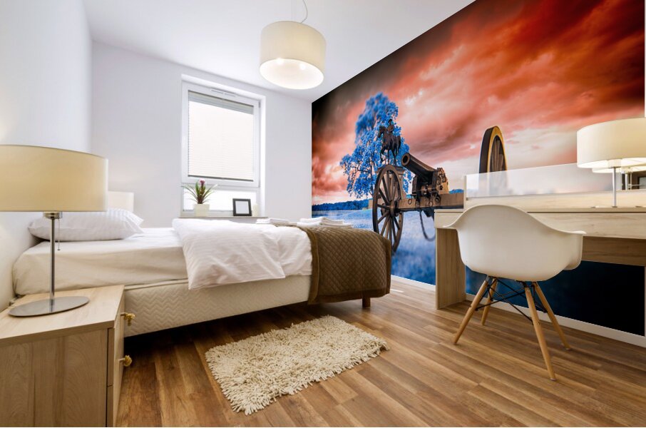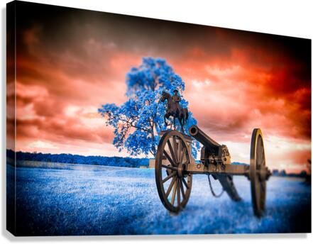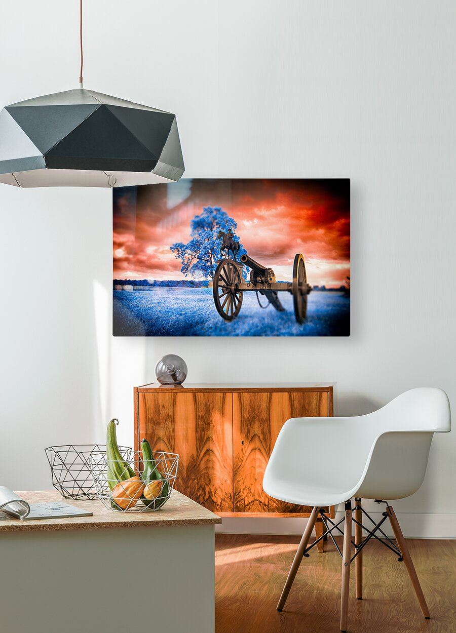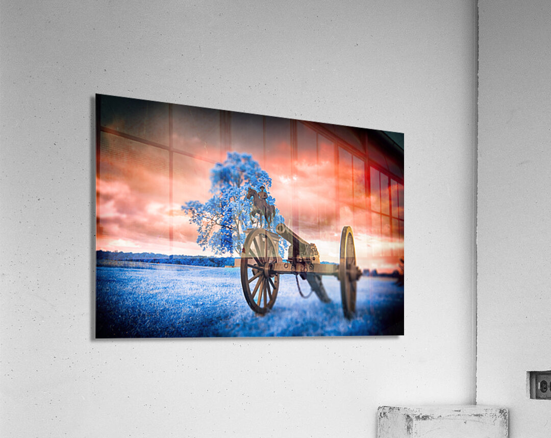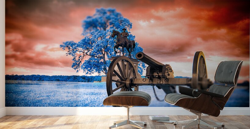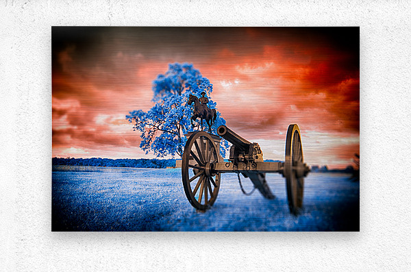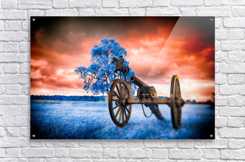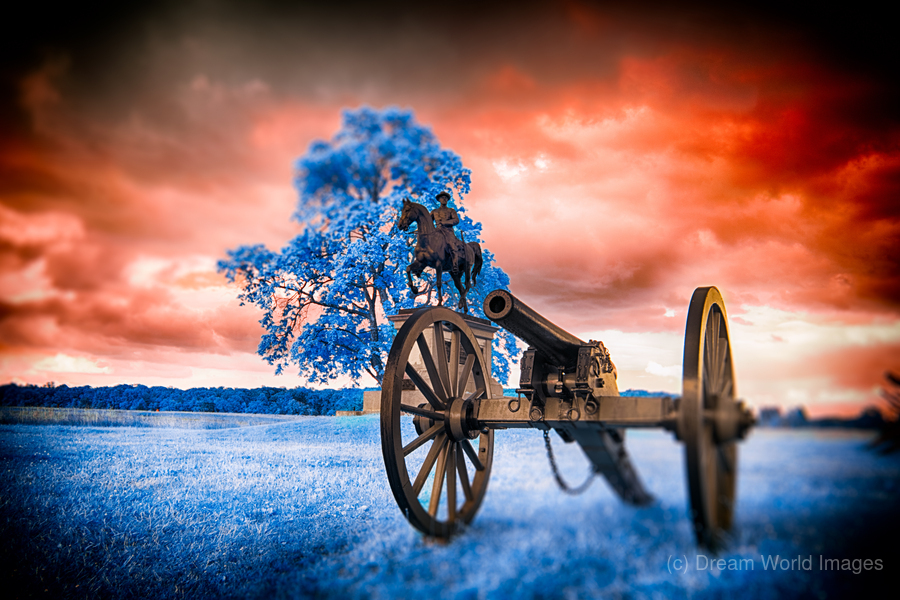 Step into a world where time stands still and history merges with fantasy in Unearthly Gettysburg. A mesmerizing scene unfolds before your eyes, with a Civil War cannon standing vigil in the foreground, its presence commanding attention. As you gaze further, a majestic tree with azure leaves dances in the breeze, casting an ethereal glow that defies earthly logic. Amid this surreal landscape, the likeness of General Reynolds from the Battle of Gettysburg stands solemnly, a beacon of strength and valor against a backdrop of fiery skies and cerulean grounds. This is a realm where reality intertwines with the extraordinary, inviting you to immerse yourself in the enigmatic beauty of Unearthly Gettysburg. The dreamy infrared images captured in Gettysburg add a mystique to the scene, enhancing its otherworldly allure and inviting viewers to ponder the intersection of history, imagination, and perception.