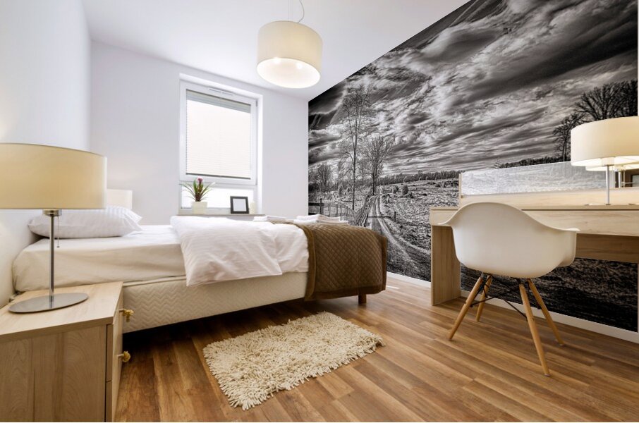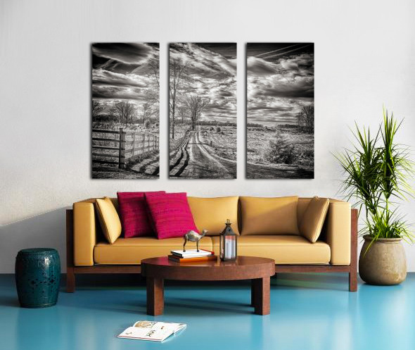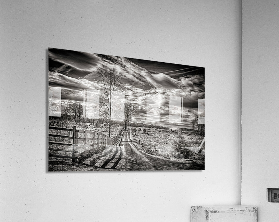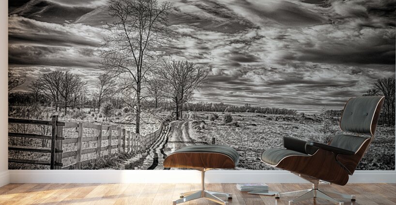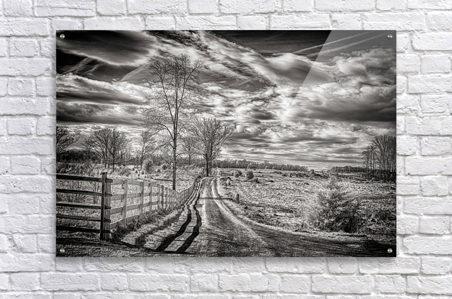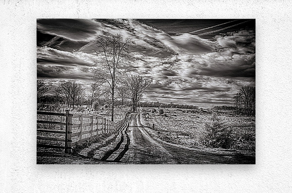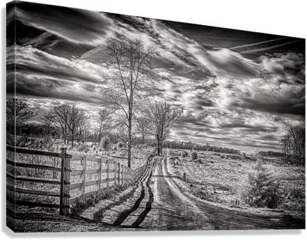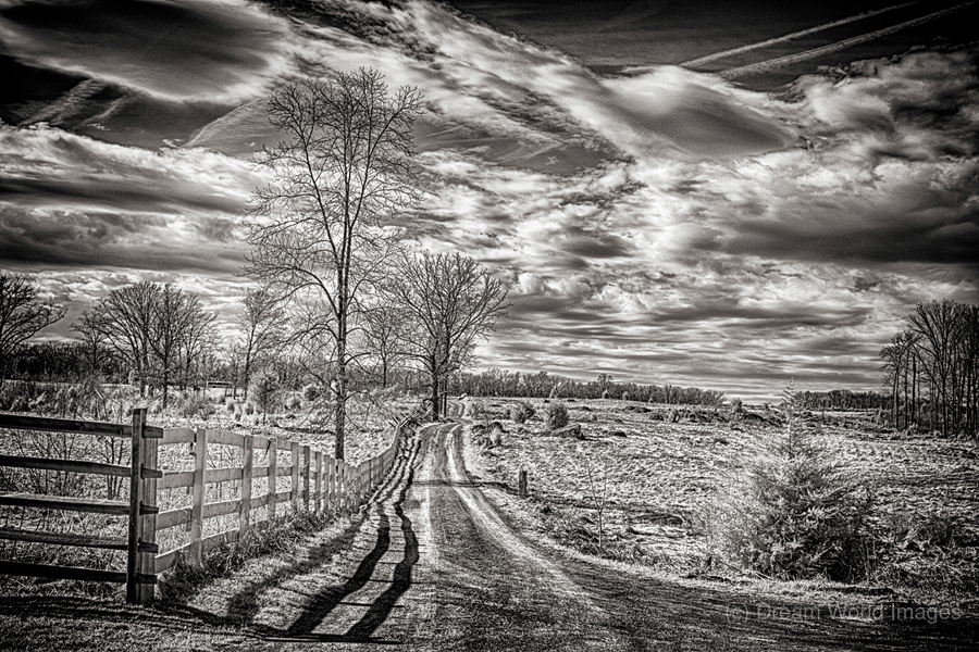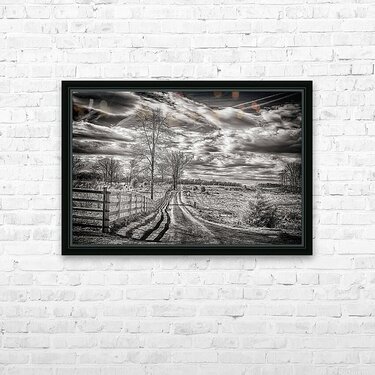 As I gazed upon the mesmerizing image captured in the heart of Gettysburg, I felt as if I had stepped into a scene straight out of The Wizard of Oz. The black and white photograph, aptly titled "Oz," depicted a dramatic rural landscape that seemed to pulsate with enchantment and intrigue. At the center of the composition, a curved dirt road wound its way through the rugged terrain, inviting me to embark on a journey of discovery. Flanked by a wooden fence, the road cast parallel, striated shadows that danced across its surface, adding to the surreal atmosphere of the scene. Lifeless trees stood as stoic sentinels scattered across the landscape like guardians of some ancient secret. Some were detailed and close by, while others formed a leafless horizon line in the distance, blending seamlessly with the moody sky above. The sky was expansive and dynamic, filled with a mix of billowing and wispy clouds that stretched and streamed across the frame, echoing the intensity and movement suggested by the rugged terrain below. The play of light and textures throughout the scene added depth and mystery to the image, evoking a sense of familiarity and otherworldliness. As I immersed myself in the mysteries of "Oz," I couldn't help but let my imagination soar. It was a moment of enchantment and wonder, where the boundaries between reality and fantasy blurred, and anything seemed possible.