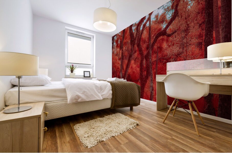 Step into a captivating world where twisted trees and hanging moss create an otherworldly and enchanting landscape that begs to be explored. The rich color palette of reddish, copper, and sepia tones enhances the dream-like quality of this mystical setting. Lush foliage and palmetto plants cover the ground, adding to the wild and untamed atmosphere. Wooden pathways and simple structures seamlessly blend into the landscape, providing a peaceful space to contemplate the wonders of this atypical woodland scene. Rooted in tranquility and wonder, this image invites you to connect with nature uniquely and enigmatically. Discover the magic of this surreal landscape and immerse yourself in its mysteries with each brushstroke captured by the artist. Explore this enchanting world and let your imagination run wild.