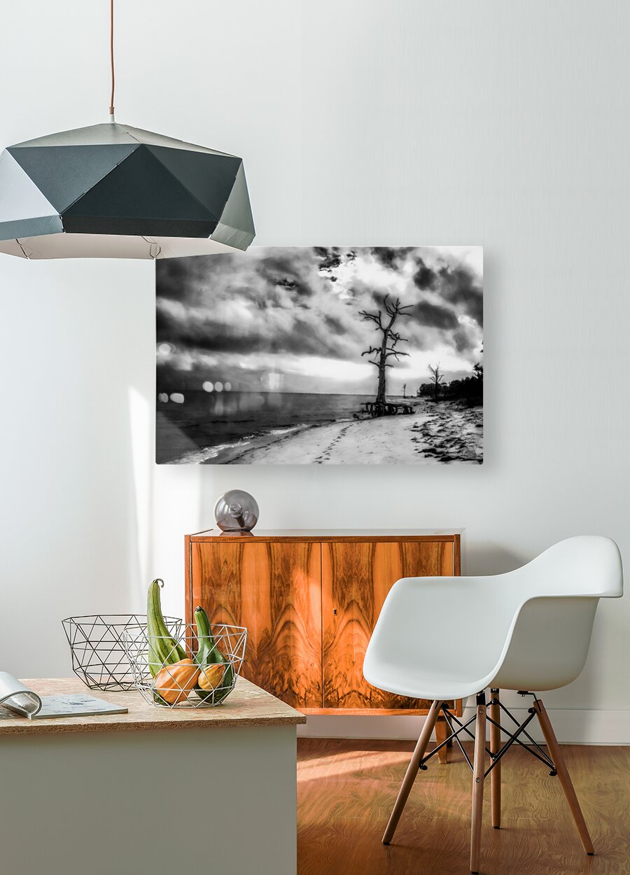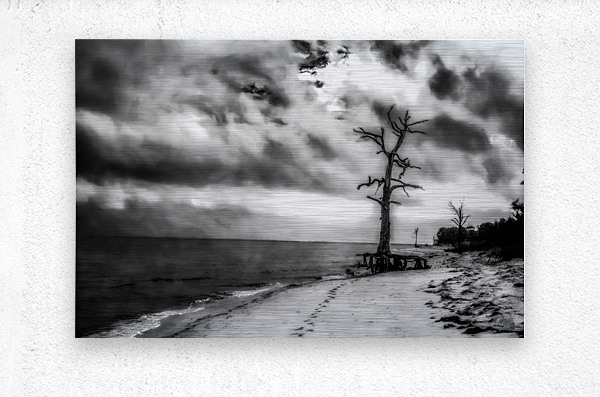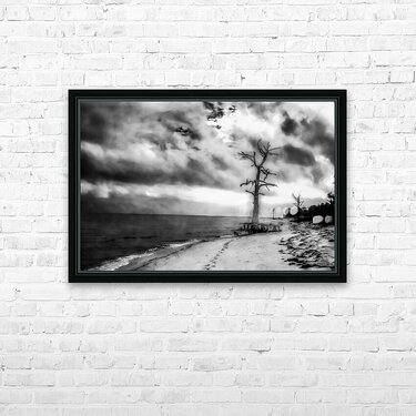 Step into a world where time stands still, and the whispers of the past echo through the windswept landscape. "Ghosts of the Shoreline" transports you to a place of haunting beauty, where a lone tree stands as a sentinel amidst the desolation of the beach. The black and white tones create a sense of mystery and intrigue, drawing you into a realm where solitude reigns supreme. The textured clouds above seem to tell a tale of forgotten memories and lost dreams, while the smooth, wet sand below speaks of the ever-changing tides of life. The tree's twisted branches reach out like gnarled fingers, reaching for something just out of reach, adding to the eerie atmosphere of the scene. In the distance, the calm waters of the sea stretch endlessly towards the horizon, a silent witness to the passage of time. As you gaze upon this enigmatic artwork, you can't help but feel a sense of melancholy and awe at the beauty of nature and the fleetingness of life. "Ghosts of the Shoreline" invites you to contemplate the deeper mysteries of existence and to immerse yourself in the haunting beauty of the natural world.
