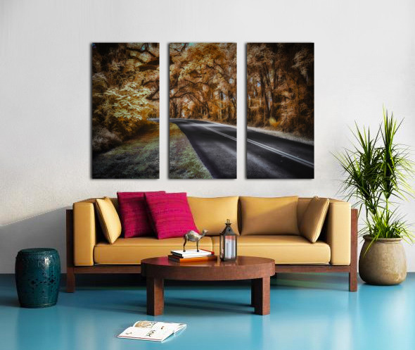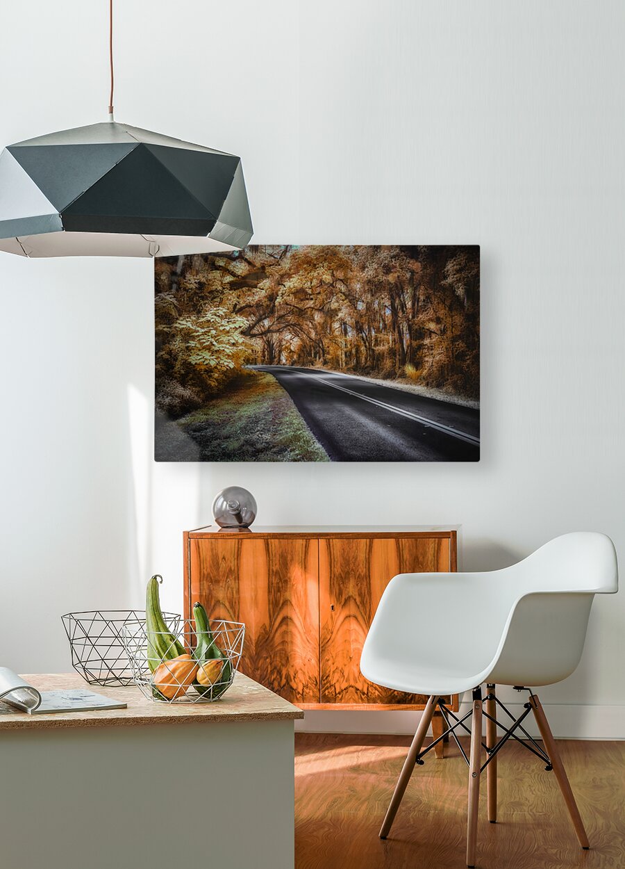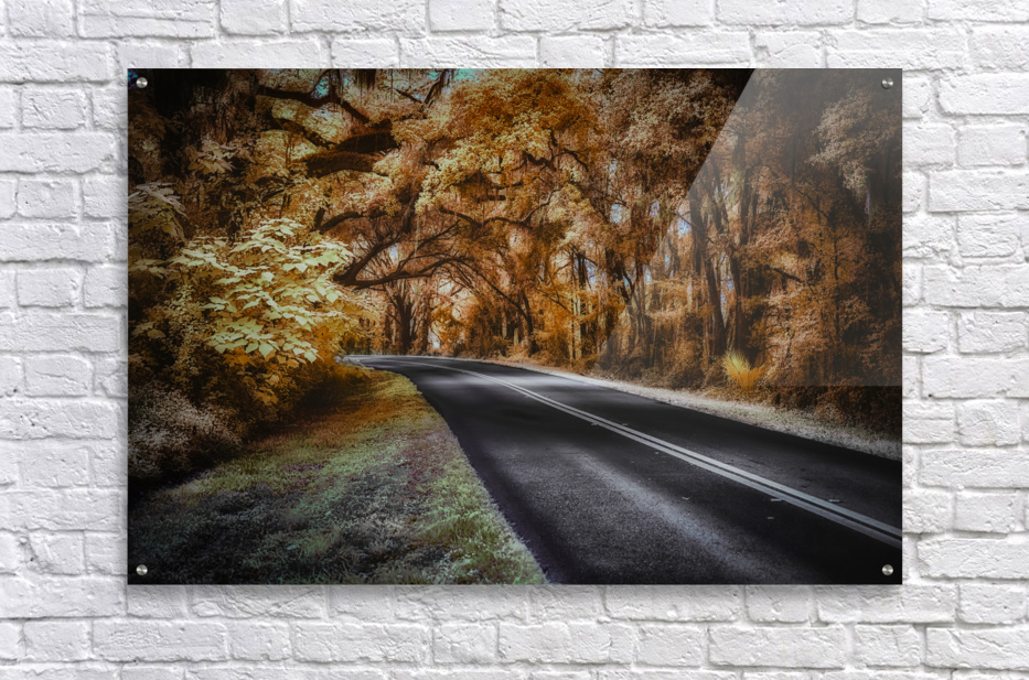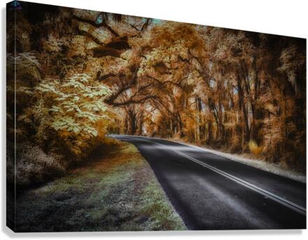 As you drive down a deserted road in the heart of Ocala, Florida, you can't help but feel a sense of curiosity and wonder. The thick forest that lines the edges of the road seems to be hiding secrets just out of reach, beckoning you to explore its depths. It's a warm afternoon, and the sun's golden rays filter through the dense canopy of trees, casting a dappled pattern of light and shadow on the ground. You decide to pull over and take a closer look, feeling drawn to the enigmatic beauty of the scene before you. You step out of your car and walk closer to the edge of the road, marveling at the intricate details of the towering trees that stand like sentinels on either side. Their branches intertwine overhead, forming a natural archway that seems to lead into another world. Mesmerized by the sepia tones blending into patches of luminous yellow and cream, you feel as though you have stumbled upon a hidden paradise. Every leaf and branch is meticulously detailed, adding to the surreal atmosphere of the landscape. The soft, diffused lighting bathes everything in a gentle glow, creating a sense of peace and serenity. As you stand there, lost in the beauty of this mysterious setting, you feel a sudden urge to capture the moment forever. Hastily, you grab your camera from the car and start snapping away, trying to capture the essence of this ethereal scene before it slips away. With each click of the camera, you feel a sense of fulfillment and excitement, knowing that you have captured a piece of Ocala's secrets in this stunning infrared curve. You can't help but wonder what other mysteries lie hidden in the depths of these enchanting woods, and you feel inspired to continue your exploration of this magical place.