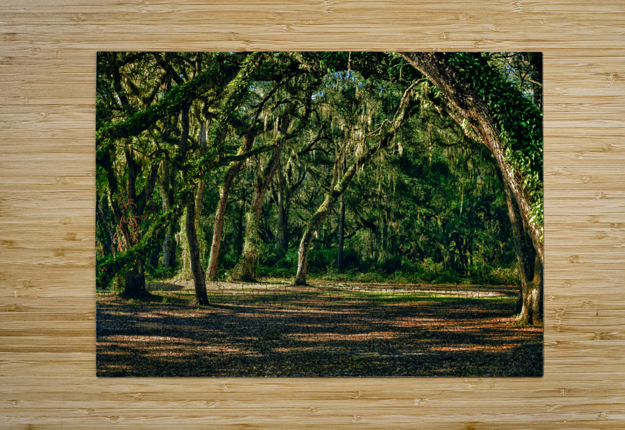 A flat cleared area under a bunch of oak trees with spanish moss in Indian Lake State Forest outside Ocala Florida.