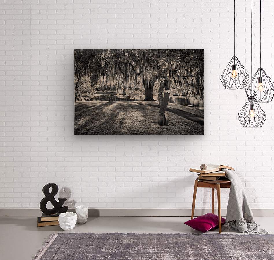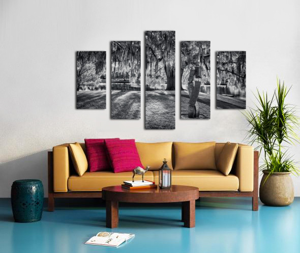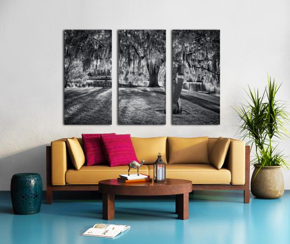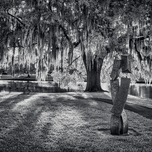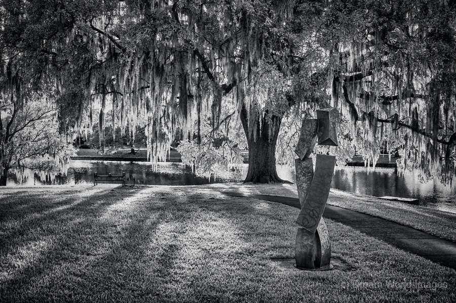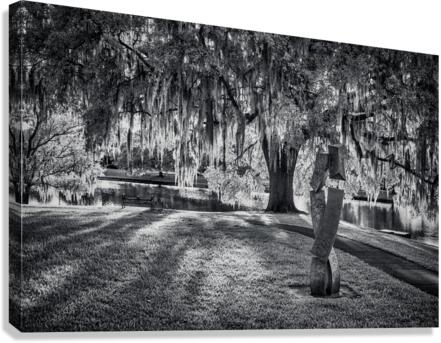 A modern sculpture stands in contemplative contrast against ancient Spanish moss-draped oaks in Ocala's tranquil landscape. Through monochromatic artistry, this composition captures the dialogue between contemporary art and timeless nature, where dappled light plays across manicured lawns while curtains of moss create nature's own artistic statement. This peaceful scene showcases Florida's unique ability to blend the modern with the mystical.