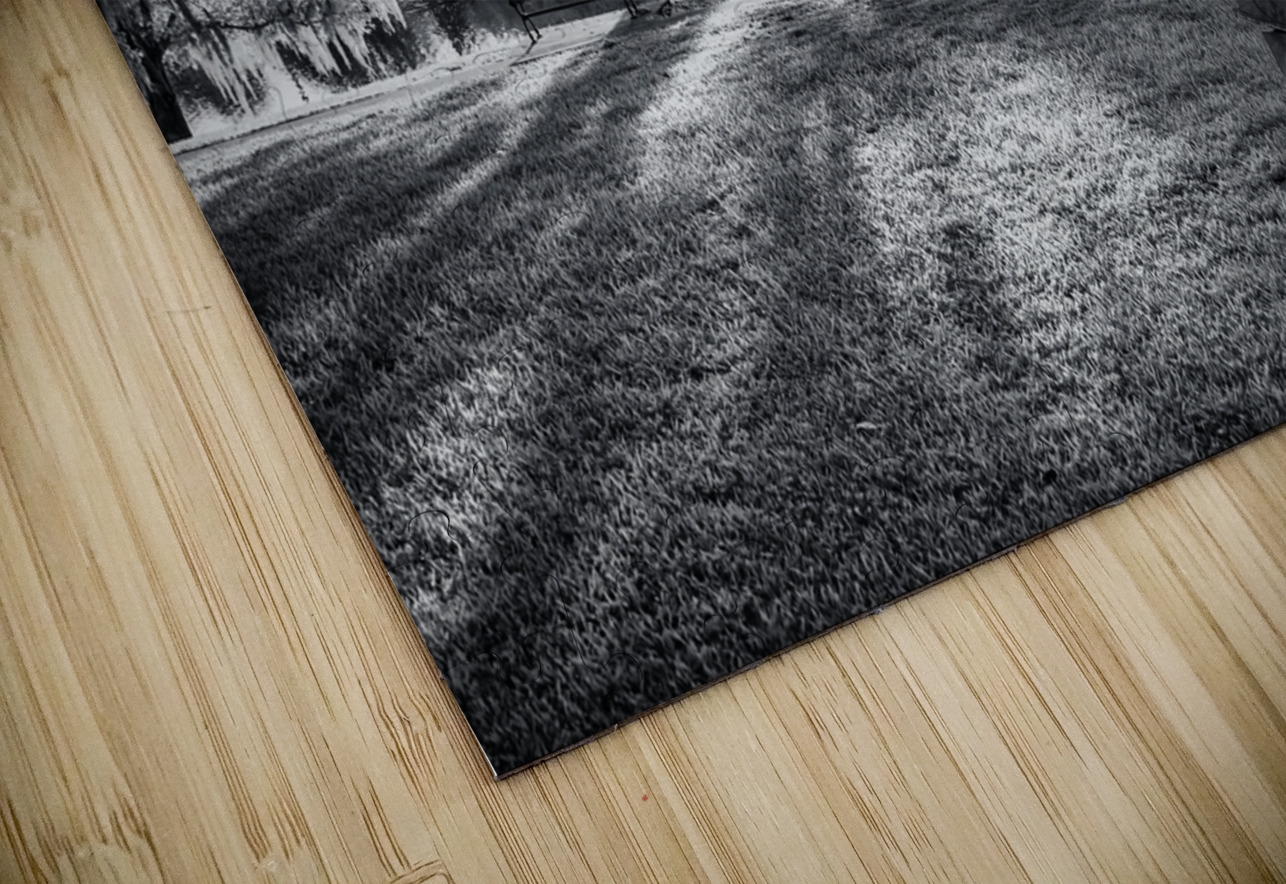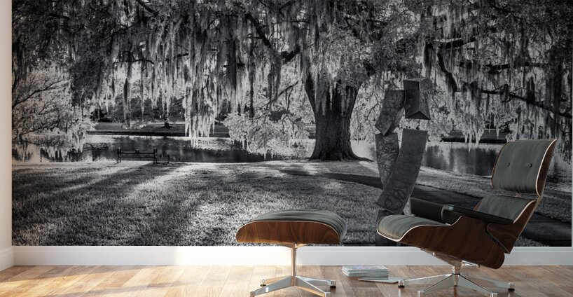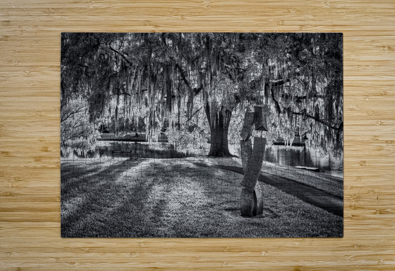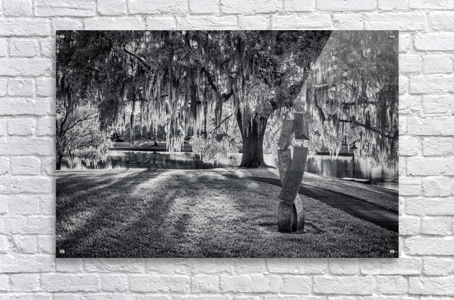 A modern sculpture stands in contemplative contrast against ancient Spanish moss-draped oaks in Ocala's tranquil landscape. Through monochromatic artistry, this composition captures the dialogue between contemporary art and timeless nature, where dappled light plays across manicured lawns while curtains of moss create nature's own artistic statement. This peaceful scene showcases Florida's unique ability to blend the modern with the mystical.