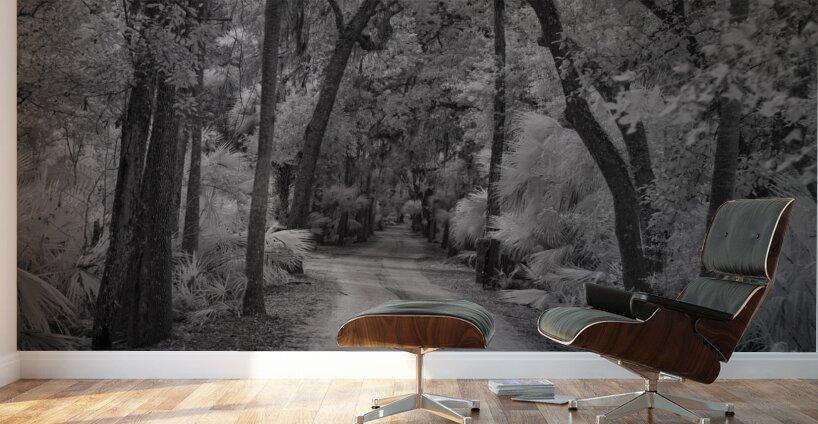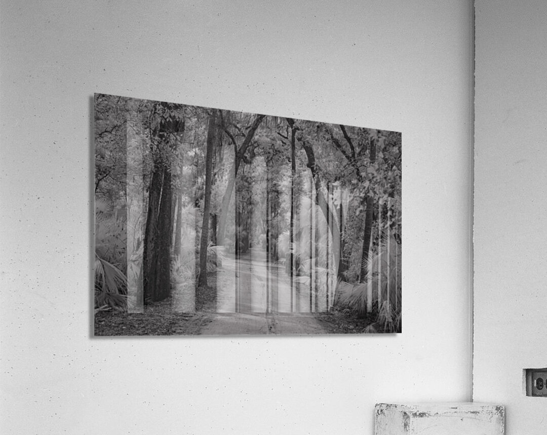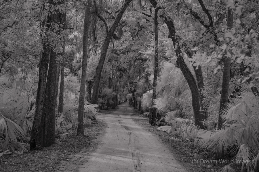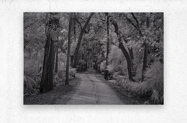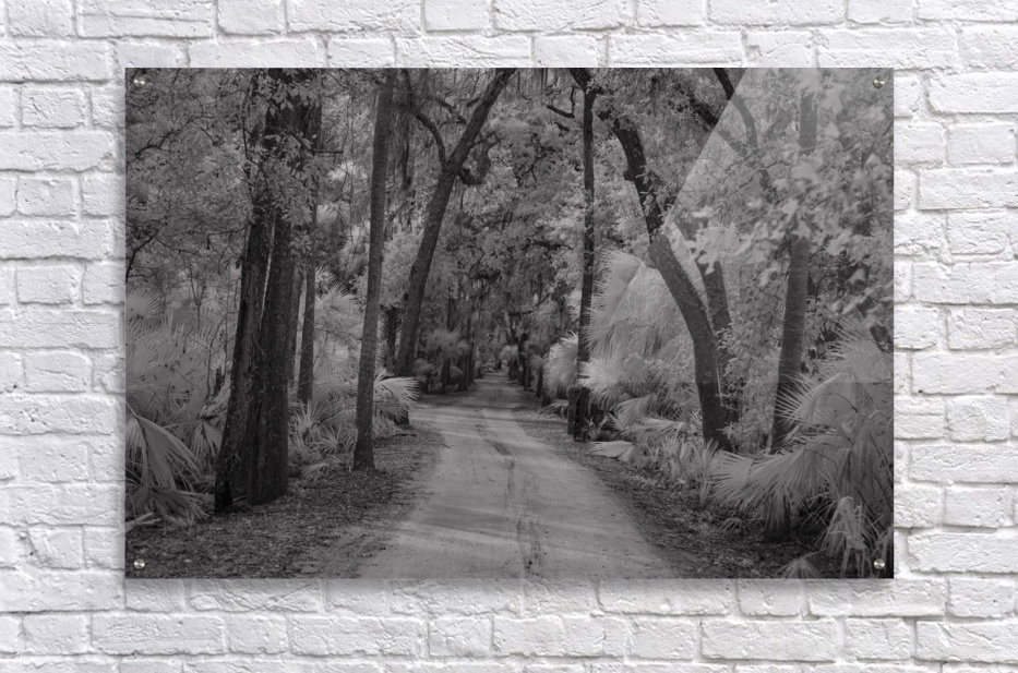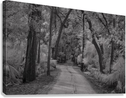 A haunting pathway through time at Florida's Bulow Plantation ruins, where Spanish moss creates ethereal curtains above a winding dirt road. Through monochromatic artistry, this historic site transforms into a meditation on the past, where ancient oaks stand as silent witnesses to centuries of Florida history. Each curve in the path invites viewers deeper into a story written in shadow and light.