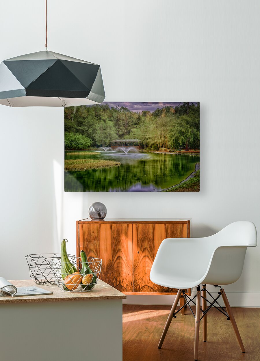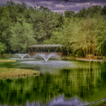 Step into a world of enchantment and tranquility with "Aqua Symphony," a mesmerizing artwork that captures the essence of nature's beauty. Glistening water ripples in a peaceful pond, reflecting the lush greens of the surrounding trees. Two symmetrical fountains dance harmoniously, adding a touch of magic to the serene landscape. As you explore further, a gentle breeze whispers through the leaves, carrying the sweet scent of blooming flowers. The sunlight filters through the canopy overhead, casting a warm glow on the scene below. In the distance, a family of ducks glides gracefully across the water, adding a touch of life to the peaceful tableau. A mysterious gazebo beckons from across the water, its intricate carvings and delicate arches offering a place of solace and contemplation. Surrounded by the sounds of nature and the gentle trickling of water, it is the perfect spot to lose yourself in quiet reflection. The image's soft focus and dreamlike quality transport the viewer to a place of wonder and awe. Each brushstroke enhances the mystical allure of "Aqua Symphony," inviting you to step into this beautiful world and let your imagination soar.