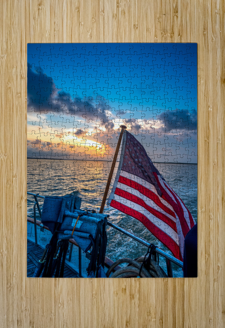 As day bids farewell across tranquil waters, our nation's flag stands proud against a canvas of golden light and dramatic clouds. This moment captures the perfect harmony between nature's majesty and American pride, where every wave and ripple catches the sun's final salute. Part of the "Serenade of Light" collection, this image transforms a simple nautical scene into a powerful reminder of freedom's beauty, inviting viewers to pause and reflect on both natural and national treasures.