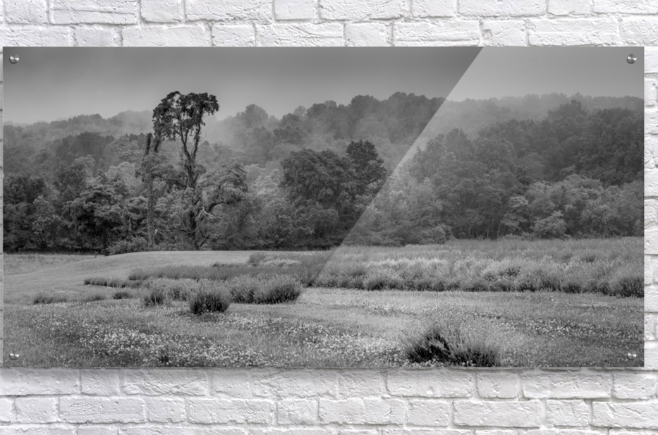 A serene black and white capture where morning fog gently embraces the landscape, creating layers of mystery and depth. Spanish moss-draped trees stand sentinel over misty meadows, their forms emerging from the ethereal haze in a dance of light and shadow that reveals nature's quiet poetry.