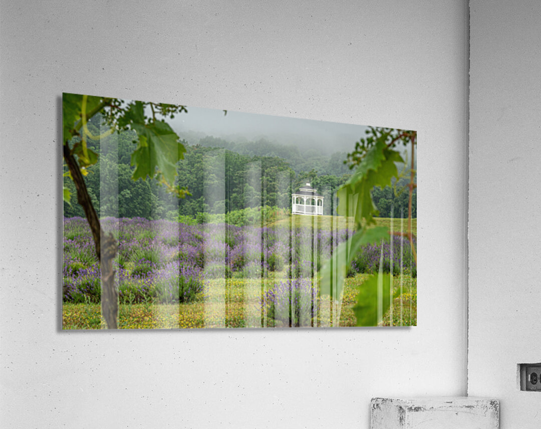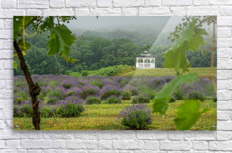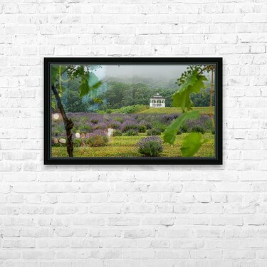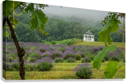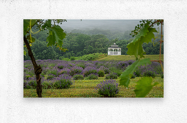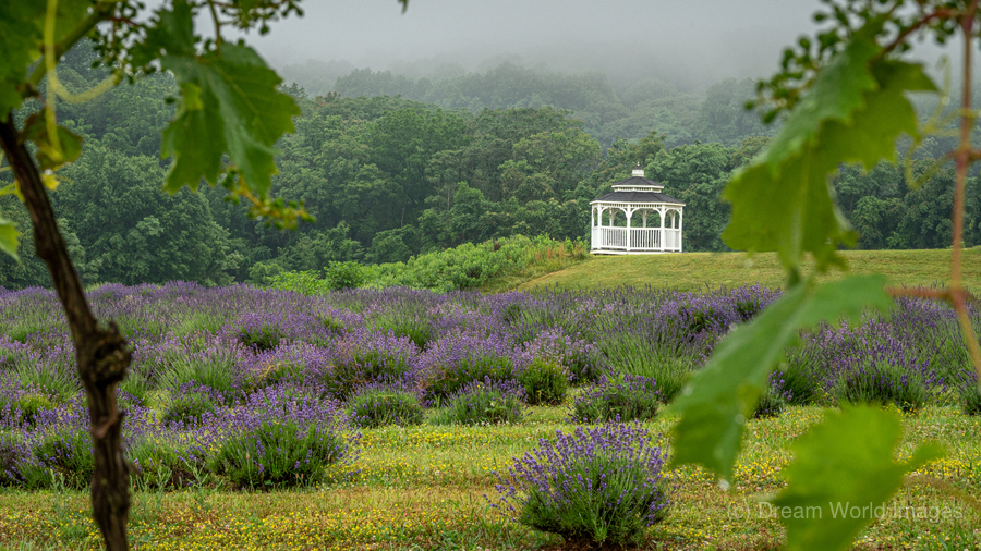 A small gazebo sitting on a knoll as seen thru a grape vine with fog on the mountain behind.