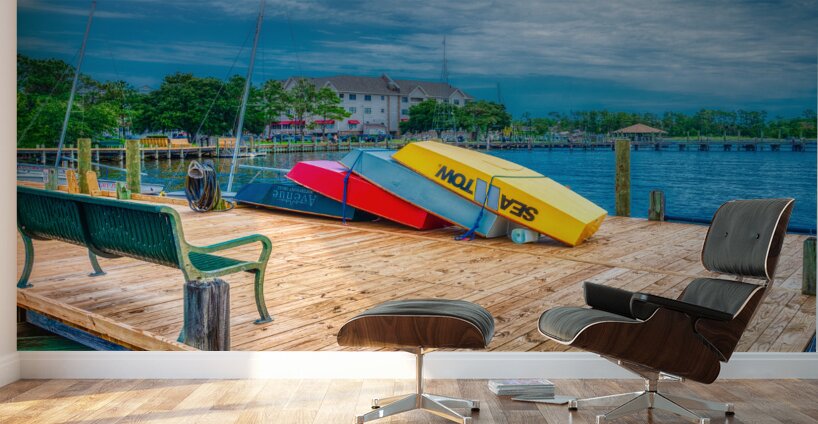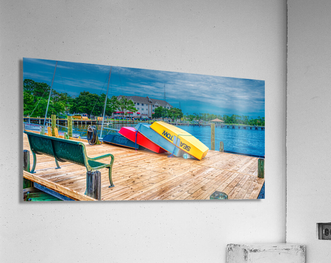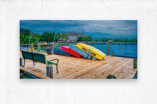 Step into the enchanting world of Manteo, North Carolina, where vibrant colors and tranquil waters come together to create a stunning piece of art. This dockside scene captures the beauty of a peaceful bay in this charming coastal town, inviting you to immerse yourself in its serene atmosphere. Wooden planks stretch out before you, leading your eyes to the serene blue water beyond. Three colorful boats rest peacefully on the dock, each adorned with intricate inscriptions that pay homage to this historic location's rich history and culture. A green metal bench beckons you to sit and take in the breathtaking view, offering a moment of quiet reflection amidst the bustling activity of the waterfront. Above, white clouds dance in the sky, casting ever-changing shadows on the water below, creating a sense of peace and tranquility unique to Manteo. This artwork is a true masterpiece, capturing the essence of beauty and serenity that defines this picturesque seaside town in North Carolina. Let it transport you to a place where time seems to stand still, and the beauty of nature surrounds you at every turn.