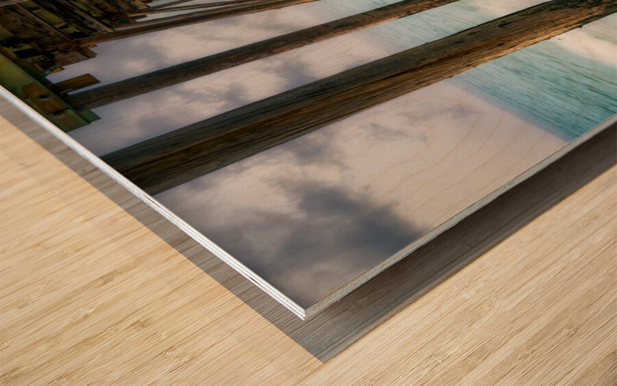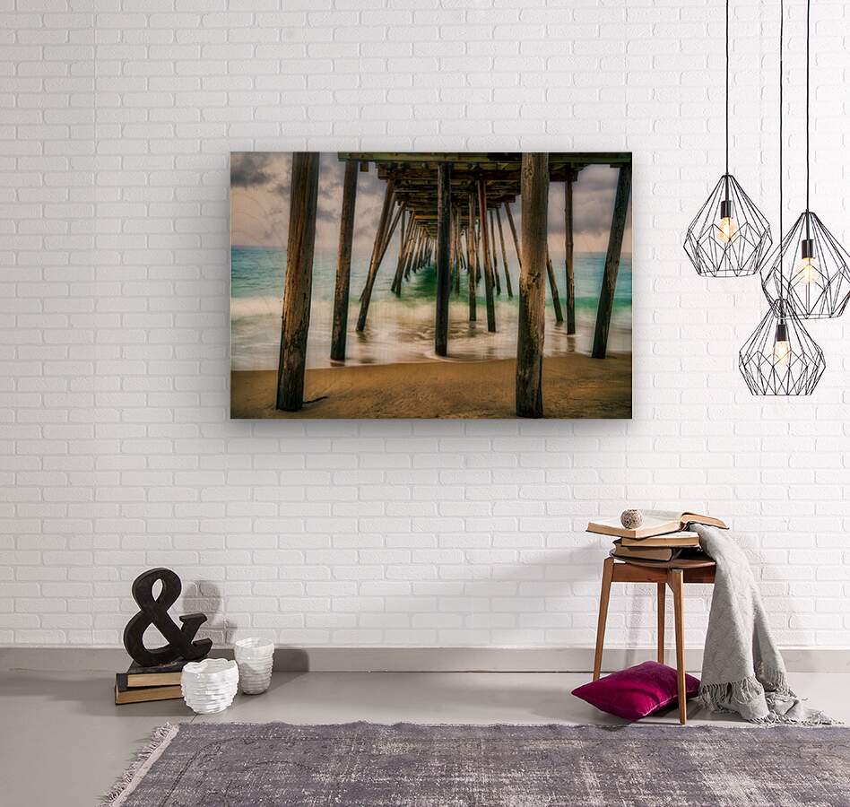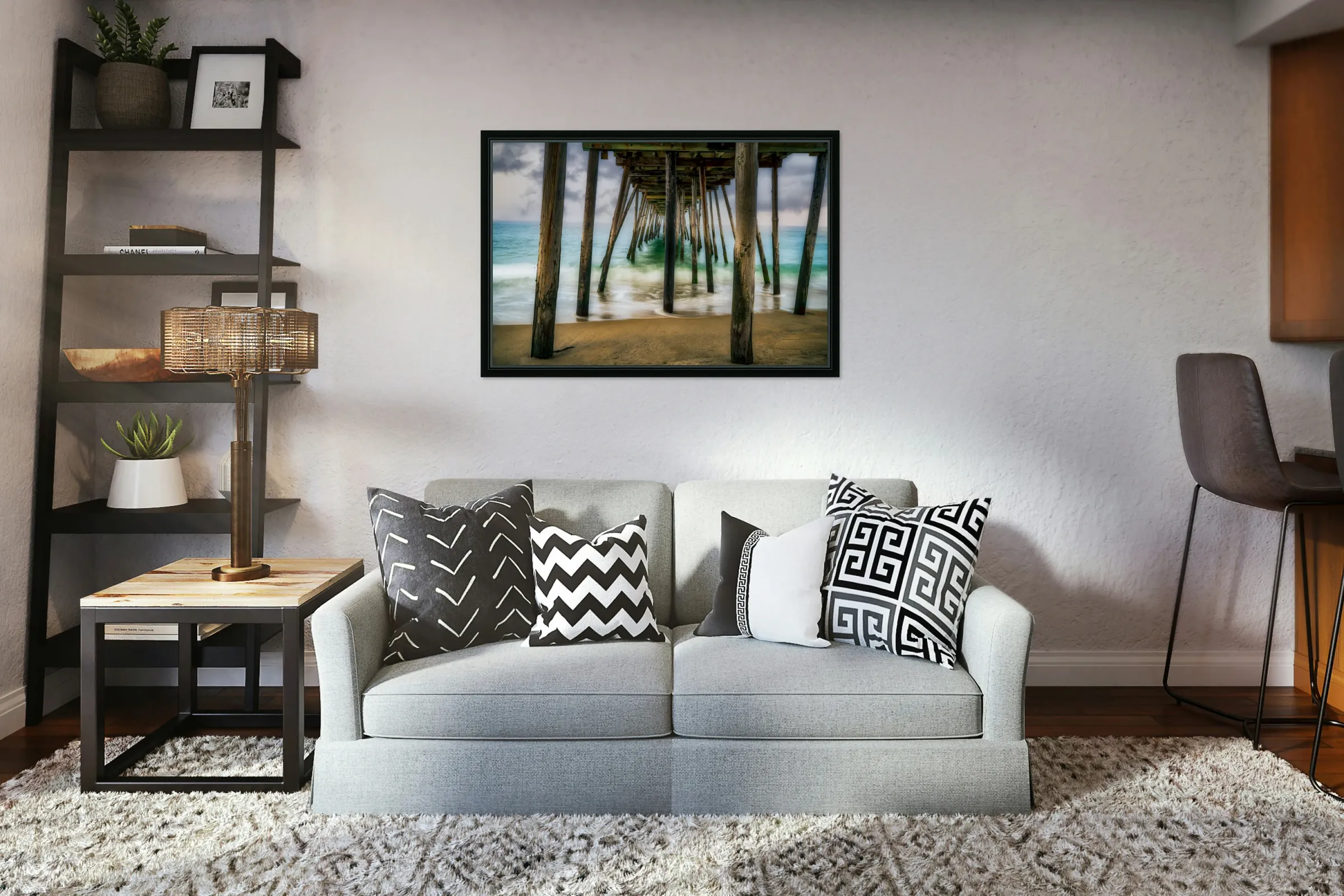 Step into a world of ethereal beauty with this captivating piece titled "Ebb and Flow." A mesmerizing view beneath a pier, where weathered wooden pill