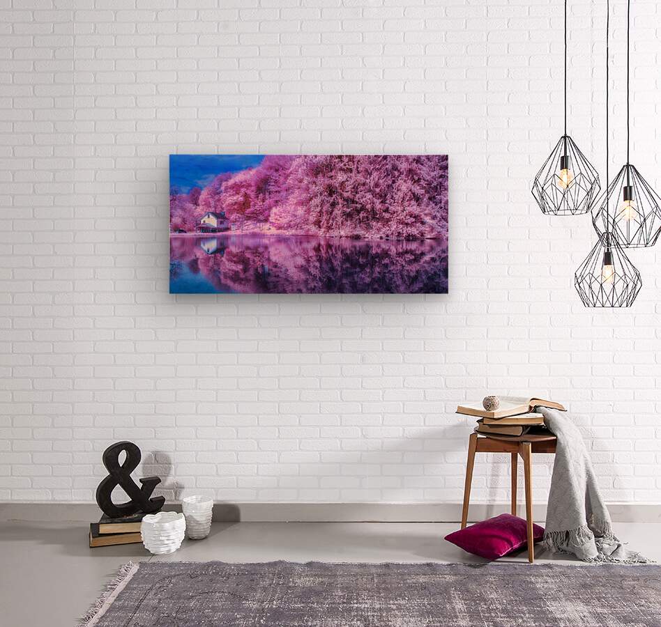 Step into a dreamlike scene where reality merges with vibrant hues. This colorful infrared image captures a small house perched on the shores of a ref...[+]
