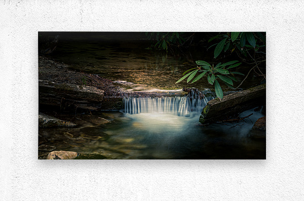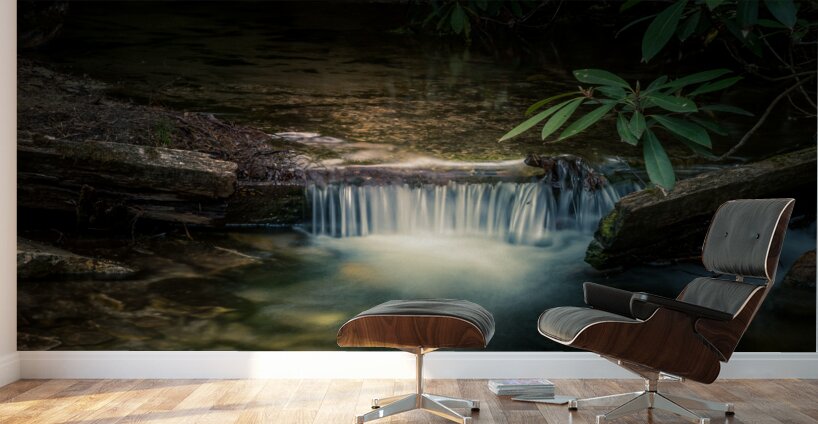 A serene moment where sunlight kisses falling water, creating a luminous display of nature's gentle power. Through long exposure photography, the cascade transforms into liquid silk while dappled light paints golden highlights across the peaceful scene. This intimate landscape capture reveals the magical intersection of light, water, and time, inviting viewers into a moment of natural meditation.