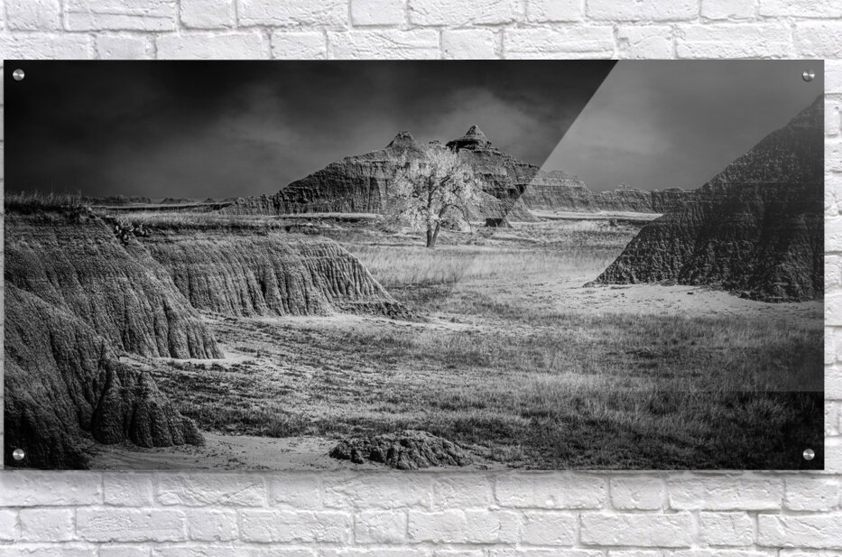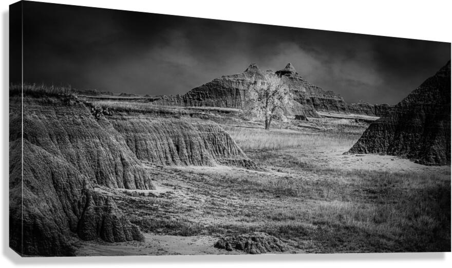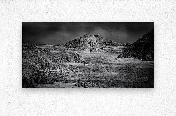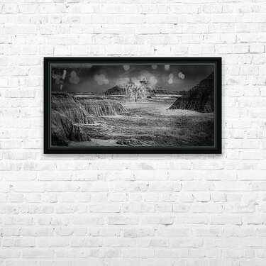A dramatic black and white capture where a lone tree stands defiant against the ancient formations of South Dakota's Badlands. The stark contrast ...[+]