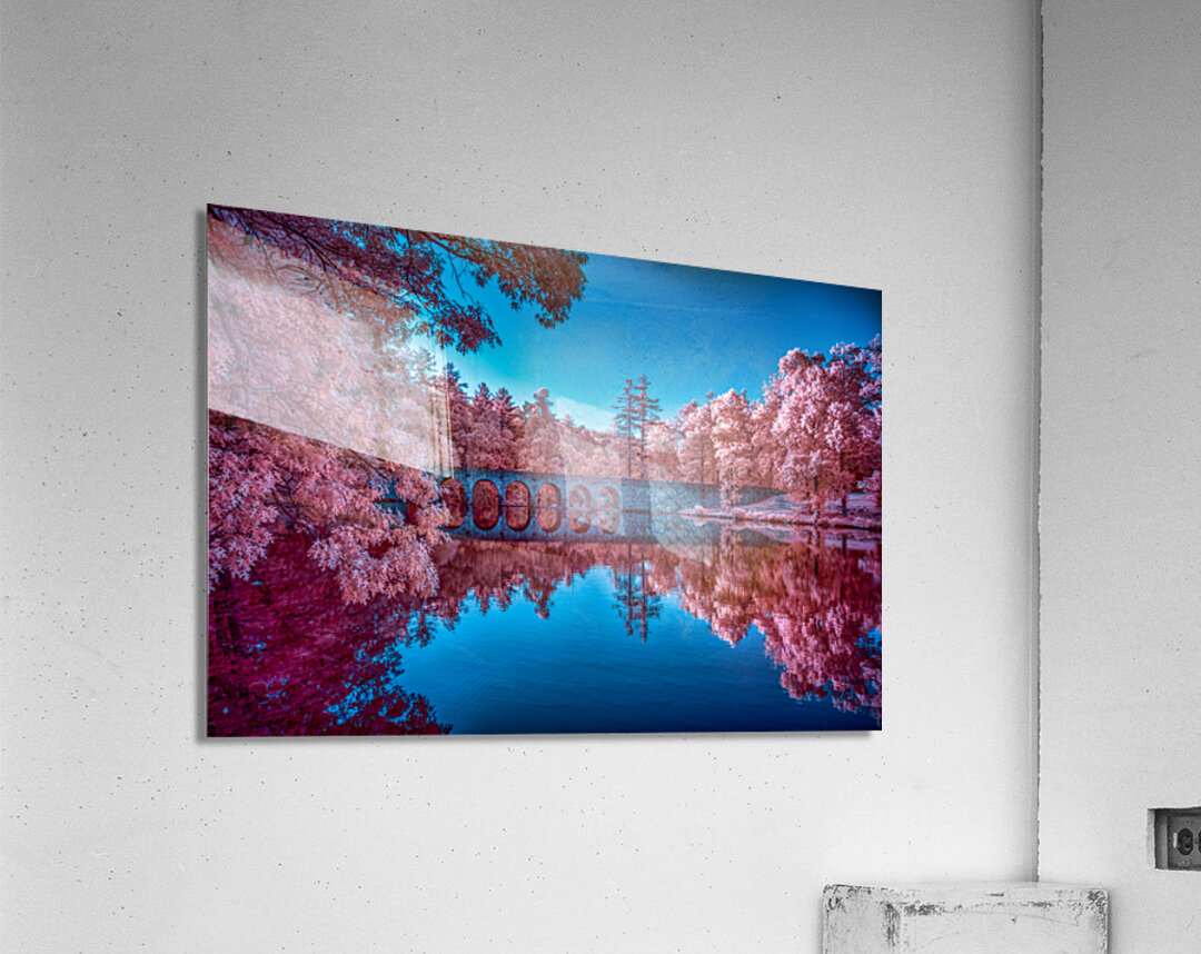 Embark on a vibrant journey through Cumberland Mountain State Park in Tennessee, where nature's palette transforms an ordinary stroll into a magical escapade. The color infrared image unfolds as a stone bridge gracefully spans a serene lake, a reflection of tranquility mirrored beneath its arches. The trees, bathed in enchanting pink hues, create a surreal symphony against the azure blue sky. Captured during a leisurely walk around the lake with my wife and our pup Cooper, the scene exudes a tranquil charm that envelops the senses. As we crossed the stone bridge, the vibrant colors of the infrared spectrum brought the landscape to life in a way that transcended the ordinary. The pink trees, a testament to the park's natural beauty, cast a captivating reflection in the lake, creating a mesmerizing dance of colors. This color infrared image narrates more than just a picturesque scene; it tells a story of a peaceful afternoon spent in the heart of Cumberland Mountain State Park. As Cooper wagged his tail in joy, the stone bridge became a symbolic gateway to a world where nature and companionship merge in a harmonious blend of serenity and vibrant beauty.
