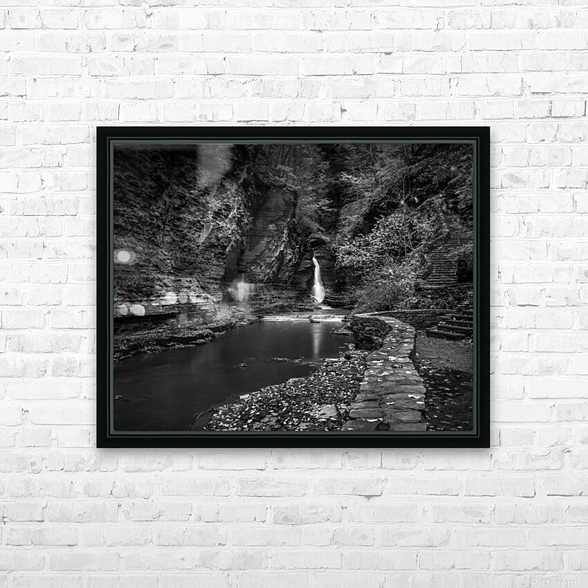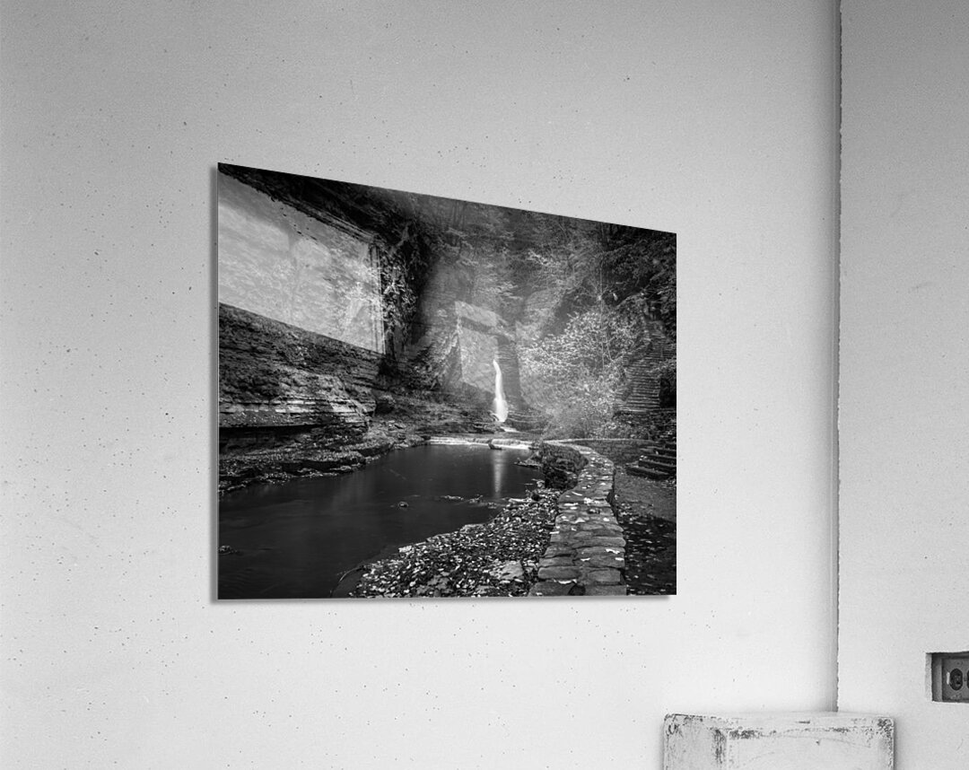 Deep within the ancient walls of Watkins Glen Gorge, a delicate waterfall creates nature's own spotlight against weathered stone. Through monochro...[+]