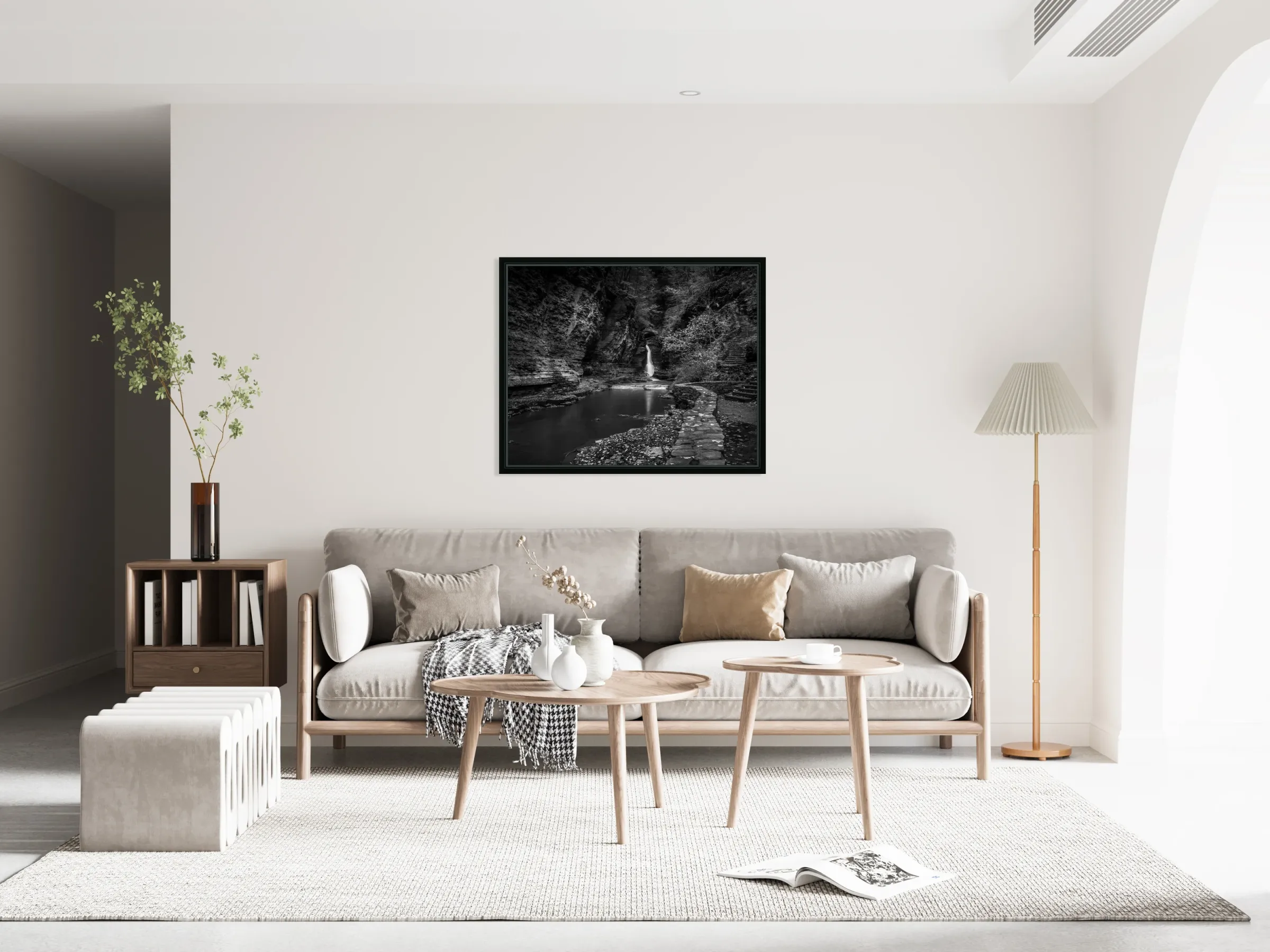 Deep within the ancient walls of Watkins Glen Gorge, a delicate waterfall creates nature's own spotlight against weathered stone. Through monochromatic artistry, this intimate scene captures the eternal dialogue between water and rock, where centuries of patient carving have created a natural amphitheater. The peaceful pool below offers perfect reflection, completing this meditation on time's artistic hand in New York's legendary gorge.
