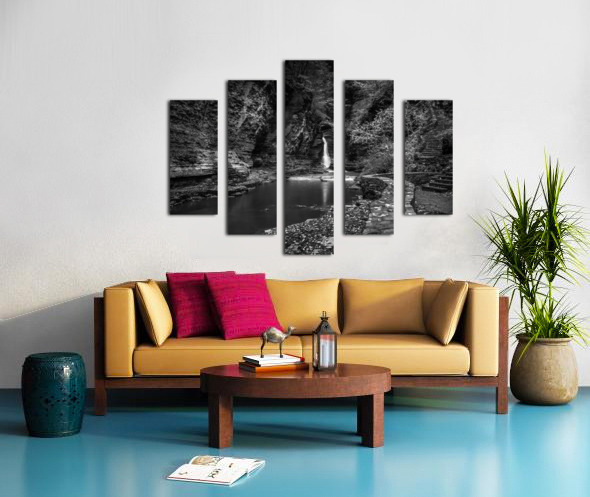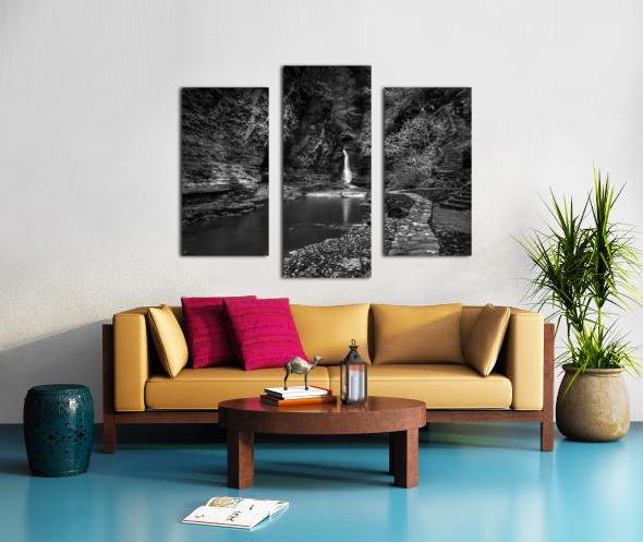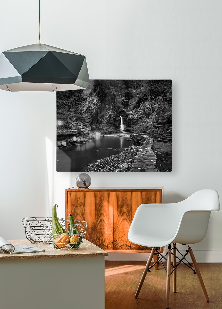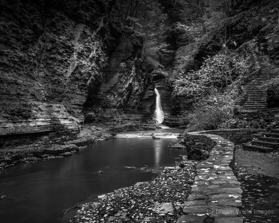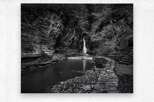 Deep within the ancient walls of Watkins Glen Gorge, a delicate waterfall creates nature's own spotlight against weathered stone. Through monochro...[+]