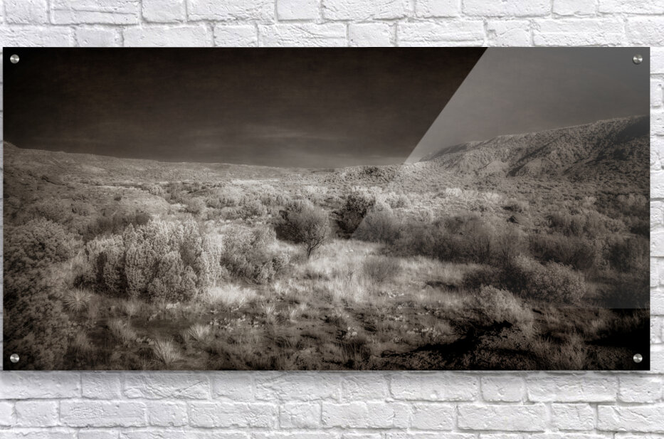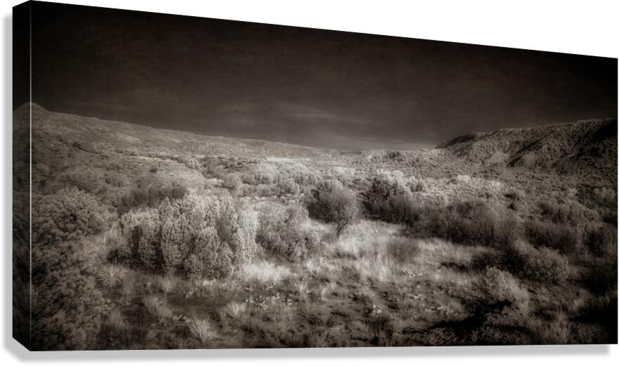 At the bottom of Palo Duro Canyon in West Texas lies a masterpiece of nature captured in "Aetherial Vistas: Palo Duro Canyon." This captivating artwork transcends the boundaries of reality, transporting the viewer into a realm of ethereal beauty and tranquility that only the depths of this majestic canyon can offer. This mesmerizing grayscale landscape painting presents a rugged and undulating terrain adorned with lush vegetation and scattered trees that seem to dance in the play of light and shadow. The chiaroscuro interplay creates a mesmerizing depth, drawing the viewer deeper into the scene. At the same time, the distant rolling hills beckon the soul to explore further into the canyon's hidden wonders. The absence of color only intensifies the intricate details of the natural world, inviting contemplation and reverence for the timeless beauty that surrounds us. Each brushstroke seems to whisper secrets of ancient landscapes and untold stories, leaving a lasting impression on all who gaze upon it and sparking a sense of wonder and awe that lingers long after. With its breathtaking depiction of nature's wonders, "Aetherial Vistas: Palo Duro Canyon" is sure to captivate art enthusiasts and nature lovers alike, offering a glimpse into a world where serenity and beauty reign supreme. This stunning artwork is a testament to the artist's skill and creativity, showcasing their ability to capture the essence of Palo Duro Canyon and transport viewers to a world of endless wonder and serenity.