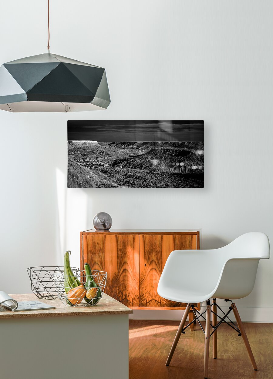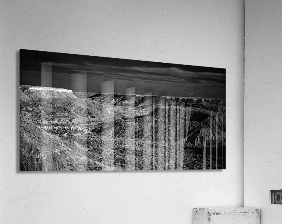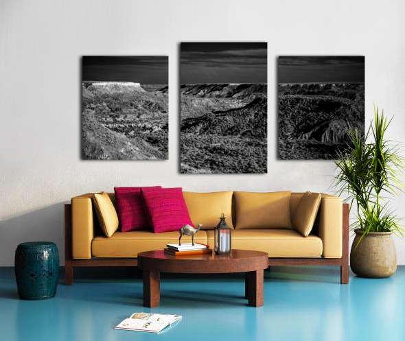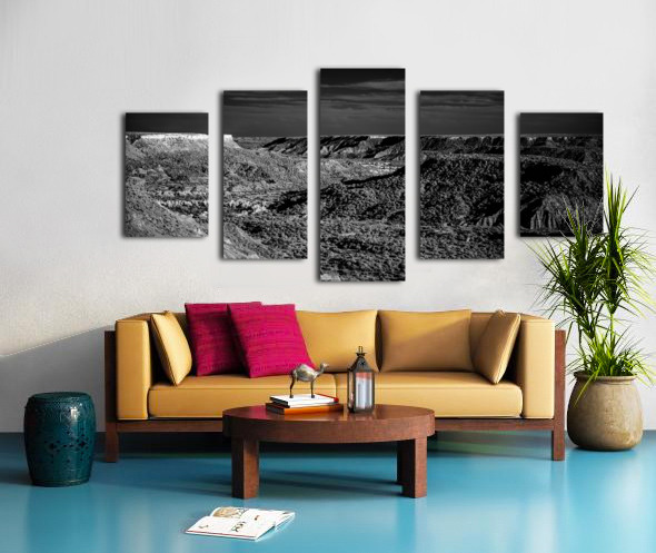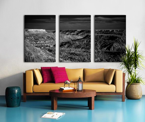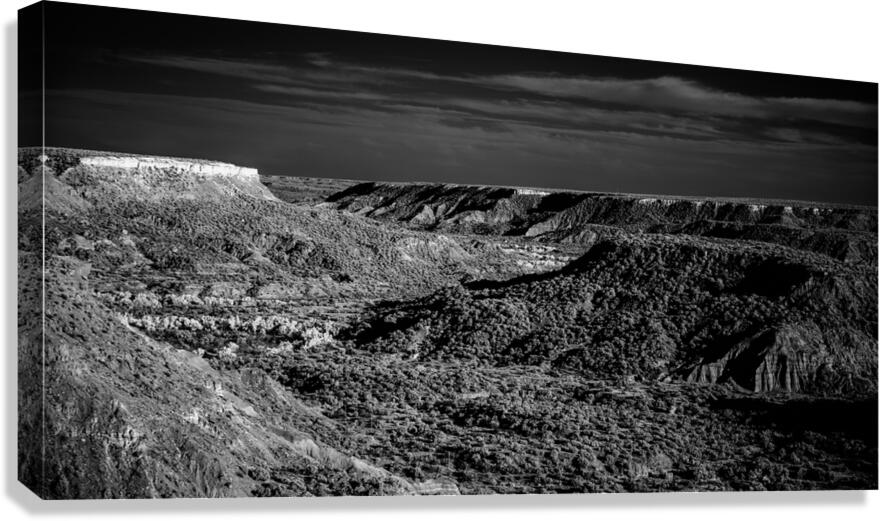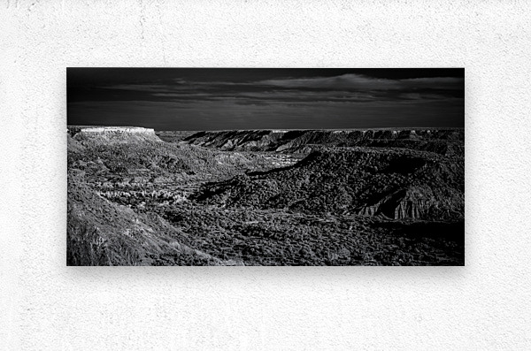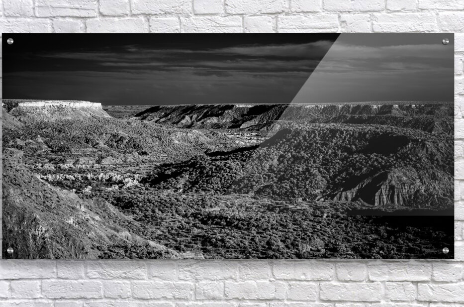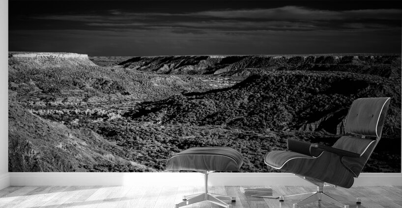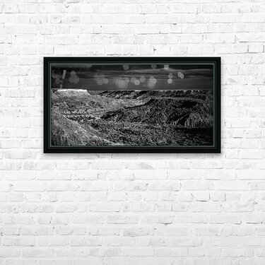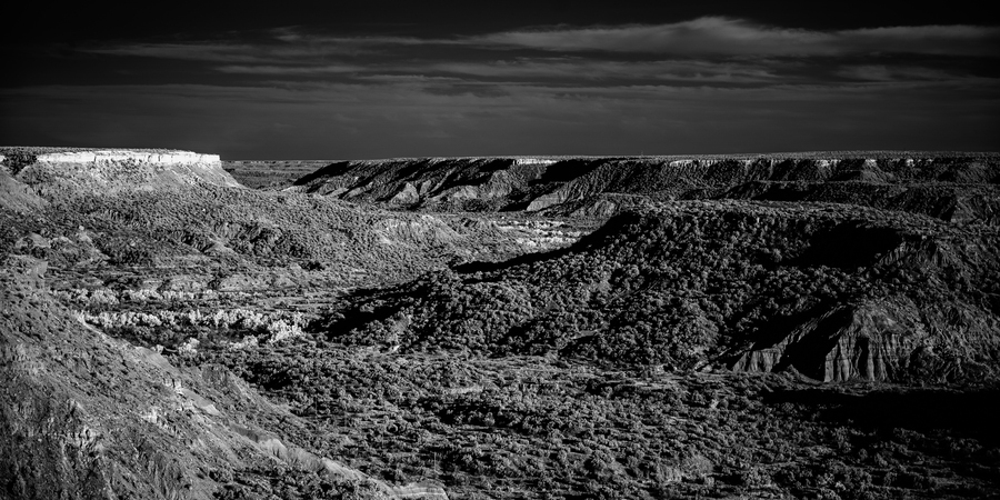 Embark on a visual journey into the untamed allure of Palo Duro Canyon, situated beyond the city limits of Amarillo, Texas, as captured through the lens of stark black-and-white infrared photography. A vast and rugged expanse, the canyon sprawls before you in an awe-inspiring panorama, revealing nature's sculptural masterpiece. As the sun descends in the Texan sky, its radiance becomes a masterful painter, casting dramatic shadows that dance upon the undulating contours of the canyon. The play of light creates an enchanting spectacle, illuminating the majestic rim with an ethereal glow. Each crevice and crag of Palo Duro Canyon comes alive, telling a story etched in the geological tapestry of time. In this captivating scene, the absence of color adds a layer of timelessness to the landscape. The monochromatic tones, rendered through the lens of infrared photography, unveil the true essence of Palo Duro Canyon. The rugged terrain, carved by the hands of nature, stands in stark contrast, while the sheer grandeur of the canyon becomes even more pronounced. As you stand witness to this monochromatic marvel, you are transported to a realm where the rugged beauty of Palo Duro Canyon transcends the limitations of color. The simplicity of black and white captures the raw, unfiltered character of the landscape, inviting contemplation and admiration for the forces that shaped it. Palo Duro Canyon, with its silent echoes of eons past, stands as a testament to the enduring beauty of the natural world, where each shadow, contour, and monochromatic hue adds to the narrative of this geological wonder.