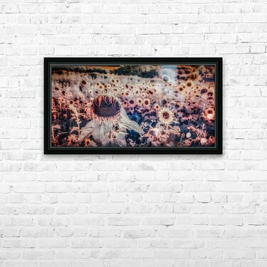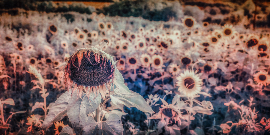 In the fading light of summer's grand finale, I discovered this moment when sunflowers transform from mere flowers into performers in nature's own twilight theater. Through infrared's revealing eye, these botanical dancers take on otherworldly hues - coral petals like delicate tutus, indigo shadows creating nature's own stage lighting. The principal dancer in our foreground stands in perfect spotlight, its weathered face telling stories of countless sun-chasing days. Its translucent petals, now like aged lace, catch light in ways that remind us that even in decline, there is exquisite grace. Behind, a chorus of fellow sunflowers creates a dreamlike backdrop, their faces turned as if watching their companion's final performance. Some say the most profound beauty exists in these moments of transition, when summer's vibrant energy softens into autumn's gentle surrender. Through my lens, these fading blooms become something more than just spent flowers - they transform into poetry written in petal and light, each drooping head and tattered leaf contributing to nature's own love letter to impermanence.