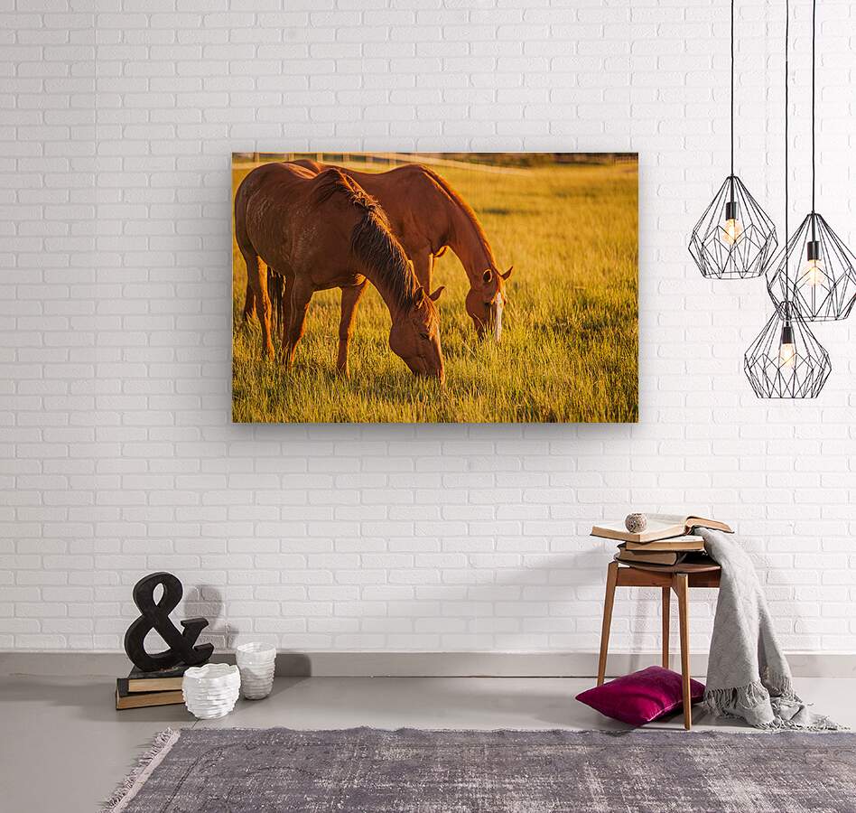 Enter into a realm of serene beauty and tranquility depicted in this captivating artwork, where two magnificent horses peacefully graze amidst lush green fields. Bathed in the soft golden glow of the sun, the scene exudes a sense of harmony and peace. With their tranquil demeanor and graceful posture, the horses emanate a quiet strength that enchants any observer. Set against the backdrop of a gently blurred fence that blends into the surroundings, the horses seem to inhabit a timeless and ethereal world. Through this mesmerizing piece, the artist skillfully captures the raw essence of nature, highlighting the majestic presence of these magnificent animals. The juxtaposition of the vibrant green grass against the warm golden sunlight creates a stunning visual spectacle that evokes both tranquility and wonder. The meticulous attention to detail in depicting the horses' anatomy and musculature reflects the artist's dedication and talent. Allow yourself to be transported to this enchanting place and experience the beauty and serenity emanating from this exquisite artwork. Immerse yourself in the tranquil atmosphere of the scene and let its peaceful vibes envelop you. With its captivating charm, this stunning piece is sure to bring a sense of calm and joy to any space it adorns.