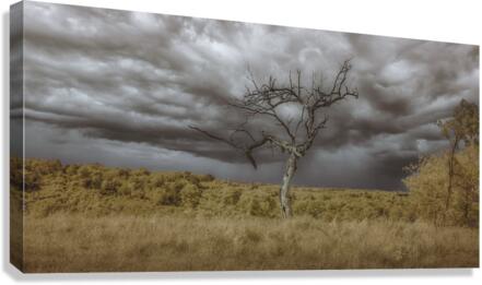 Barren Sentinel Amidst Storm's Embrace is a striking photograph that immerses the viewer in a dramatic landscape scene. Dominating the composition