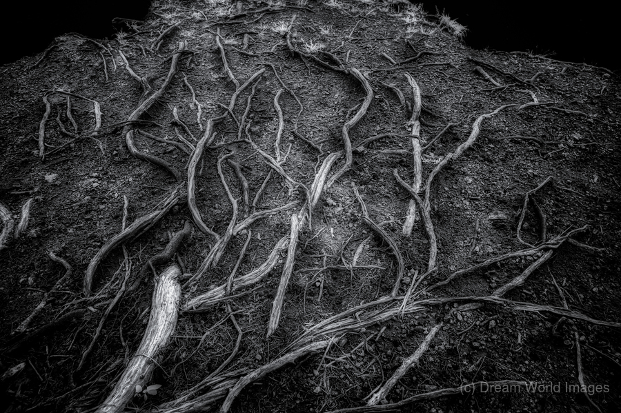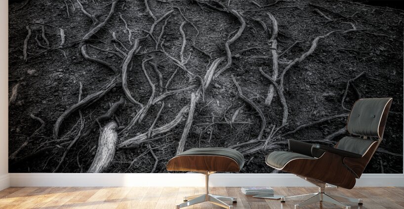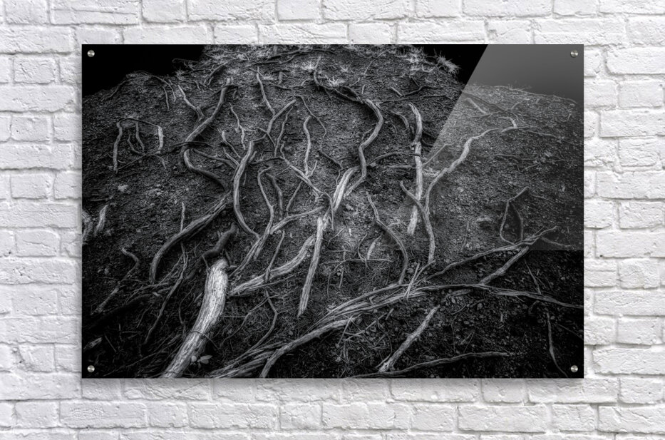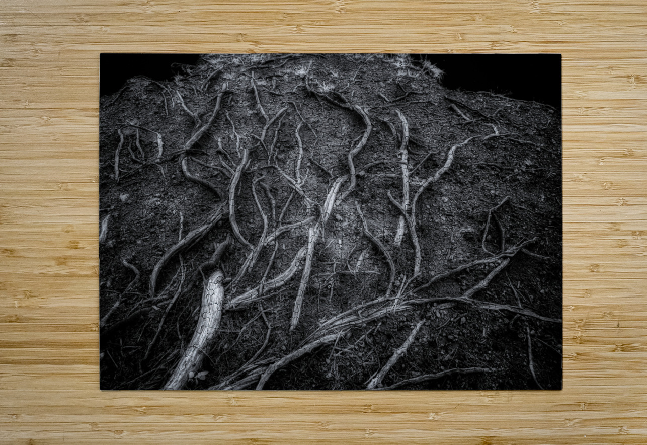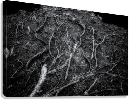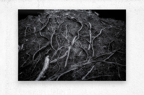 As I step into the mysterious depths of Veins of the Earth, I am entranced by the intricate dance of shadows and light surrounding me. In this captivating black and white photograph, I am greeted by the stark beauty of nature's patterns, captured in all their glory. The tree roots stretch before me, each strand varying in thickness and revealing a world unseen beneath the surface. It's as if chaos and order have come together perfectly, creating a mesmerizing display of nature's wonders. As I study the symphony of textures and details that play out against the dark earth, I feel compelled to explore further, to delve deeper into the hidden depths of the natural world. With each step, I am drawn closer to the earth's soul, eager to uncover its secrets. Veins of the Earth offers a mesmerizing glimpse into this enigmatic and mystical realm, inviting me to lose myself in its beauty and wonder.