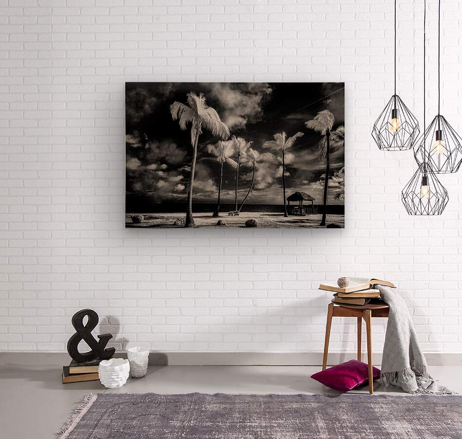 Experience the tranquility of a Tiki Picnic with this stunning black-and-white photograph. Tall palm trees sway gently in the breeze, framing a serene beach scene. A thatched-roof gazebo beckons as a peaceful retreat by the shoreline while the ocean stretches out towards the horizon, inviting you to escape into its calm embrace. The dramatic lighting in the image adds depth and contrast, creating a surreal and captivating aesthetic. This unique infrared image captures a moment of stillness and beauty, transporting you to a peaceful paradise.