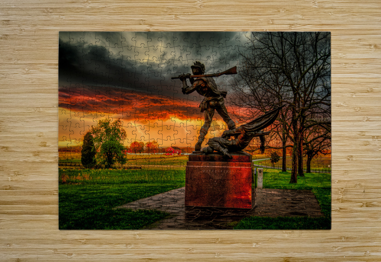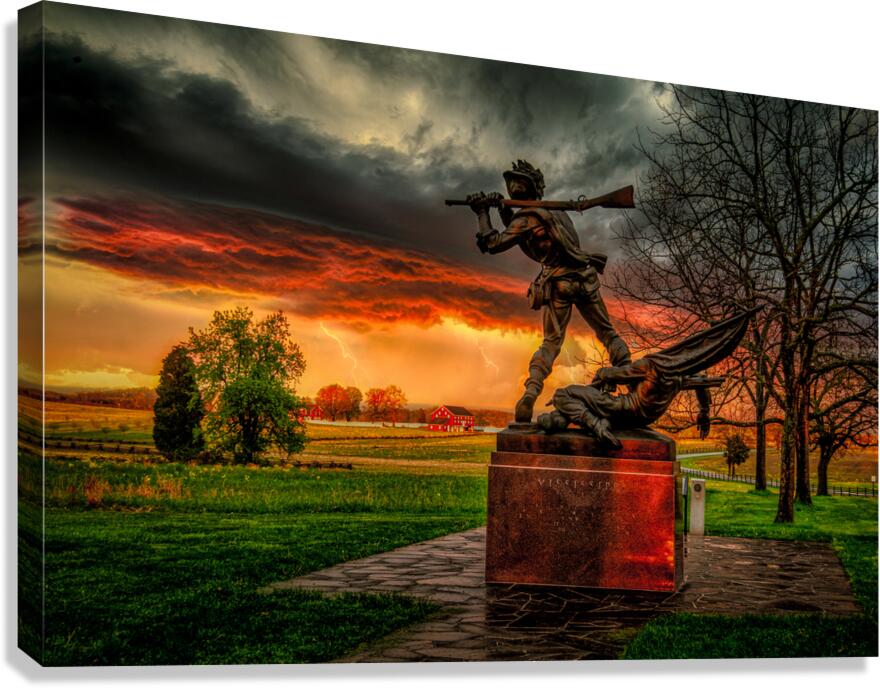 In the heart of Gettysburg, amidst the rolling hills and historic battlegrounds, stands a monument that echoes the bravery and sacrifice of soldiers from the Mississippi regiments during the American Civil War. Known simply as "The Mississippi Monument," this towering structure serves as a solemn reminder of the fierce battles fought on these hallowed grounds. As visitors approach the monument, they are greeted by a grand bronze sculpture depicting a scene of intense conflict. The central figures, representing Mississippi soldiers, are captured in the heat of battle. One stands defiantly, clutching his rifle with determination etched upon his face, while another lies wounded at his feet, a testament to the harsh realities of war. The monument's design is intricate, with intricate detailing and dynamic composition that draws viewers into the scene, evoking a sense of the chaos and heroism of battle. Surrounding the central figures are depictions of fallen comrades, their names immortalized in the monument's stone base. But the Mississippi Monument is more than just a symbol of war; it is a tribute to the resilience and spirit of the soldiers who fought here. Each element of the monument, from the intricate carvings to the solemn inscription, serves as a testament to the valor and sacrifice of those who served. Visitors to Gettysburg cannot help but be moved by the Mississippi Monument, standing as a silent sentinel over the battlefield. It serves as a reminder of the cost of freedom and the enduring legacy of those who gave their lives to defend their beliefs. As the sun sets over the rolling hills of Gettysburg, the monument stands as a beacon of hope, reminding us of the power of courage and determination in the face of adversity.