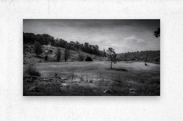 Amidst the tranquil beauty of today's Little Round Top lies a poignant reminder of its tumultuous past. Once the stage for a violent clash between Union and Confederate armies during Day 2 of the Battle of Gettysburg, this now serene landscape bears witness to the scars of war while exuding a sense of peace and resilience. In "Peaceful Remnants," a black-and-white landscape photograph, the remnants of that violent clash are captured with striking clarity. The image unveils an open field where scattered foliage, tree stumps, and fallen branches serve as silent witnesses to the ferocity of battle. Yet, amidst the natural decay and regrowth, there is a sense of quietude and renewal. The landscape gently undulates a testament to the ebb and flow of history, with grassy clearings and clusters of trees painting a picture of both serenity and drama. The sky above, filled with soft, billowy clouds, adds texture and depth to the scene, imbuing it with a timeless quality that transcends past horrors. As viewers gaze upon "Peaceful Remnants," they are invited to contemplate the juxtaposition of violence, tranquility, conflict, and regeneration. It is a reminder that even in the aftermath of great strife, nature endures, offering solace and hope amidst the echoes of conflict.